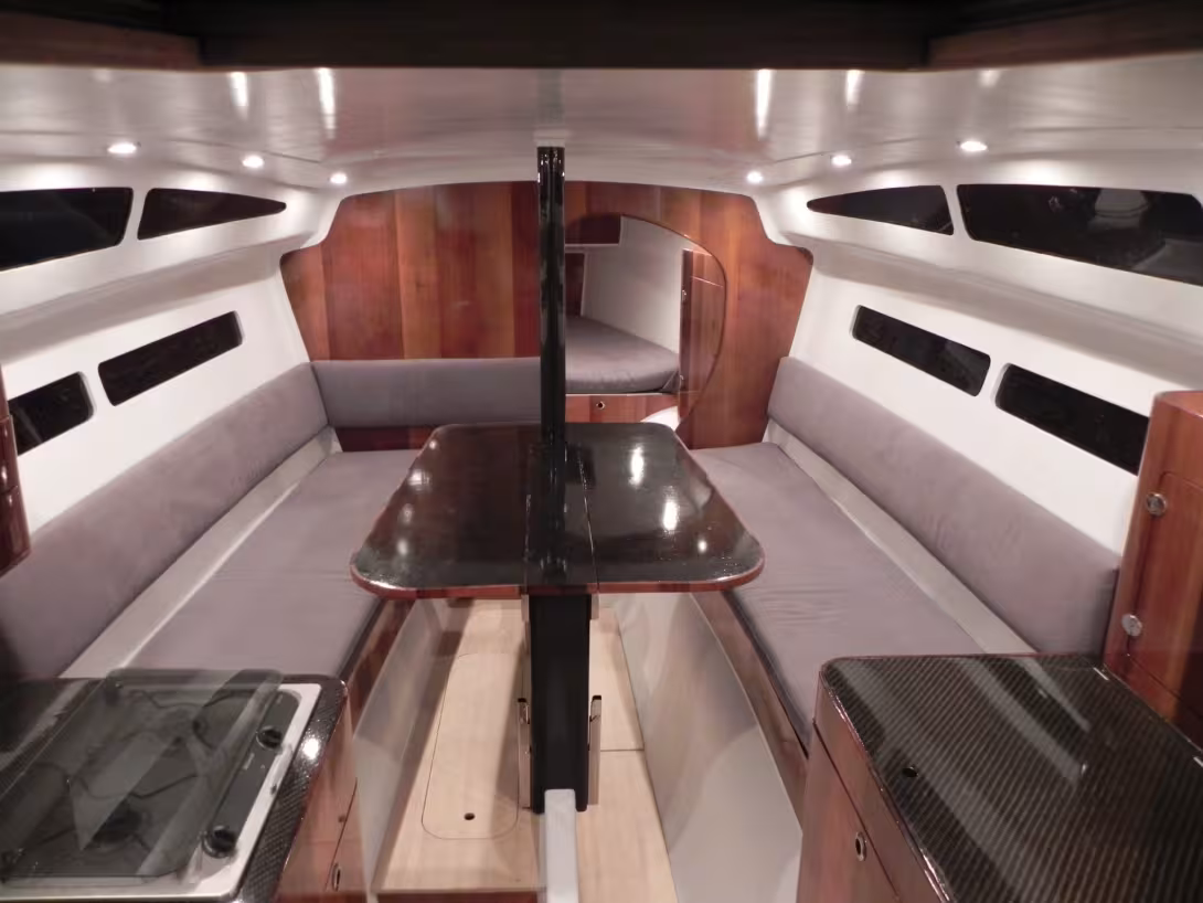 The multihull was designed by a particularly experienced trio - Jan Andersen, Roland Gaebler and Jan Verroken. The floats have sufficient volume to be able to sail flying a hull - in racing mode, of course... In the same spirit, this trimaran is equipped with twin rudders to always be able to maintain a course. Comfort remains the priority though: the saloon can seat eight people, and there’s 6’5” (1.95 m) of headroom under the companionway hatch. Auxiliary propulsion is provided by an electric motor whose batteries are fed by 450 W of solar panels. The Marlin 33 is foldable and even dismantlable for transport on a trailer.