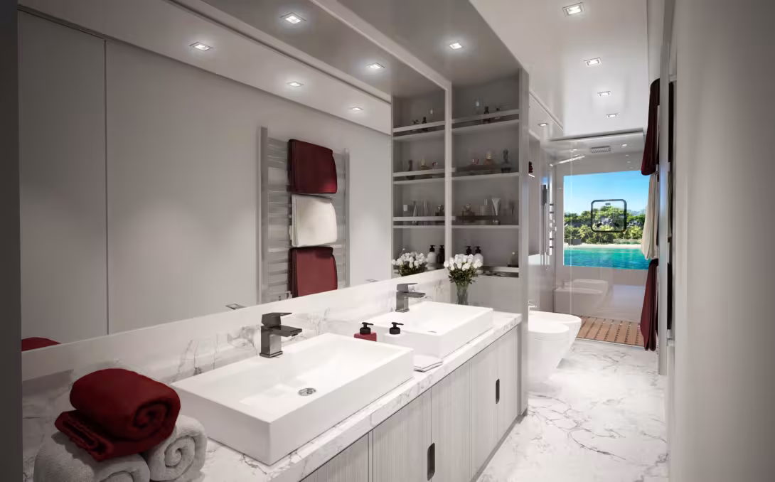 In this size, which is already particularly comfortable in terms of usable surface area, this new model sets the bar very high, with a total surface area of around 8,500 square feet (800 m²), of which half is habitable space. The saloon offers 1,175 sq ft (109 m²) and the owner's cabin 590 sq ft (55 m²). The Spaceline 100 Hybrid also boasts 2,430 sq ft (226 m²) of solar panels, allowing its two diesel engines to be used only for longer, high-speed passages. On the decks as well as inside, the Spaceline offers, as its name suggests, freedom from constraints in the living areas. With a headroom of 7’3” (2.20 m), 360° views from the saloon and on the 740 sq ft (69 m²) flybridge, panoramic views from the cabins and omnipresent luxury: designer Carlo Mezzera seems to have achieved a particularly seductive result. This new model will be offered in small production runs, but it can be made available as a one-off catamaran.