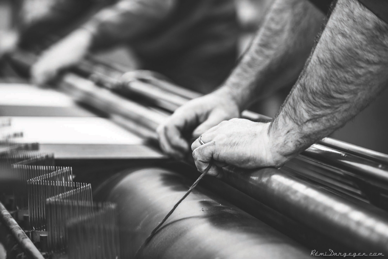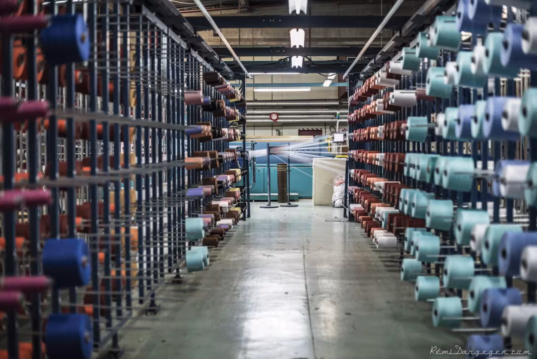 A visit to the factory at Wasquehal in the Nord region is an opportunity to discover a trade that has its roots in mankind’s earliest days, but that has not ceased to renew and modernize itself ever since. The complex of buildings, where about 350 people work, covers over 11 acres (45,000 m²), to which must be added 2.7 acres (11,000 m²) of storage for the finished products, which are located in Fretin, about 6 mi (10 km) away. Although weaving is part of the industrial heritage of many French regions, it is becoming more and more difficult to find qualified personnel due to the lack of training schools or specialized institutes. Most apprentices will therefore be trained in the factory. And watching the men and women working, right from the first stage of production, one can imagine that the training could be a lengthy process. Warping, as the complex process is called, is the process of aligning up to 4,500 threads side by side (30 threads per 3/8” / 1cm), to form the warp mounted on warp beams, which are large bobbins that are then used for the actual weaving process. This task requires skill, precision and concentration. To give you an idea, no less than 250,000 bobbins are used each month, with one bobbin representing 19 miles (30.6 km) of yarn, which produces over 270 million square feet (25 million m²) of fabric each year. Impressive!