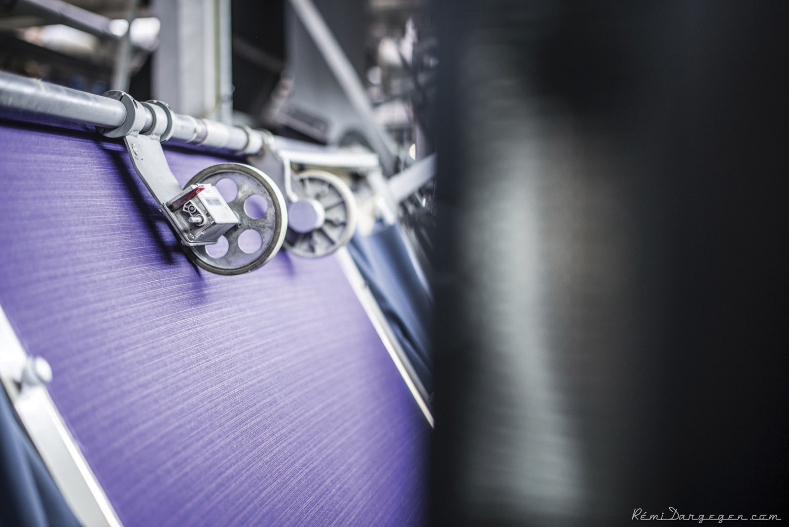 The next step is therefore the actual weaving. Most people imagine an oldfashioned loom with its small carriages criss-crossing across the weft that is obtained during the warping. This principle, which has been unchanged for centuries, has been modernized, first with mechanical shuttle-throwers and then with air-jet systems. On the latest generation of machines, it gets difficult to follow these ultra-fast movements with your eyes. This technique makes it possible to produce fabrics with simple patterns, such as stripes. For more elaborate designs (the so-called jacquard), each of the threads of the warp does not necessarily move at the same rate as its neighbors, which further complicates this well-oiled system, and it is computers that have brought a new lease of life to this operation. In this workshop, where the temperature and hygrometry are permanently controlled, a kind of mist seems to float around the machines. These are the fibrils, small bits of fluff that escape from the reels and which hang in the air. To avoid health risks, an incredible ballet of automated vacuum cleaners is constantly moving up and down the aisles between the looms, sucking up this cloud.