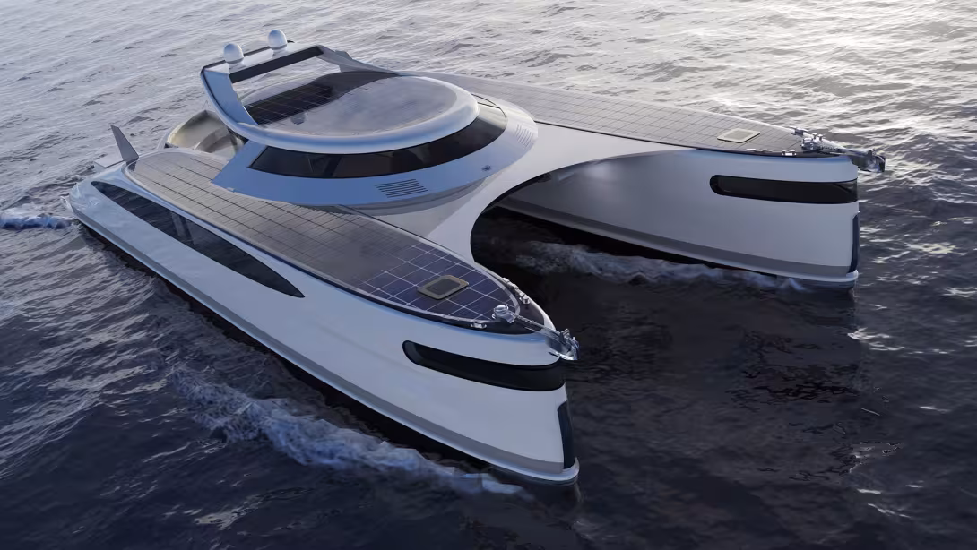 Under way, the cylinders retract a little, though not completely, in order to generate energy from moving through the water - twin 890 HP engines ensure a maximum speed of 24 knots. An electric drivetrain and a large area of solar panels are also provided. The central platform has a large load elevator operated by four winches, making it possible to carry vehicles. In each hull, two or three cabins are installed in addition to the galley and bathrooms. Pagurus can accommodate up to 8 passengers, plus 4 crew members.