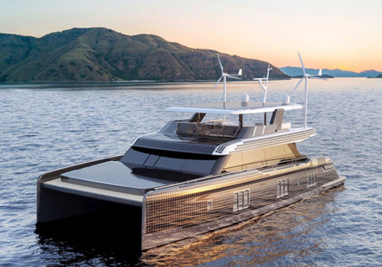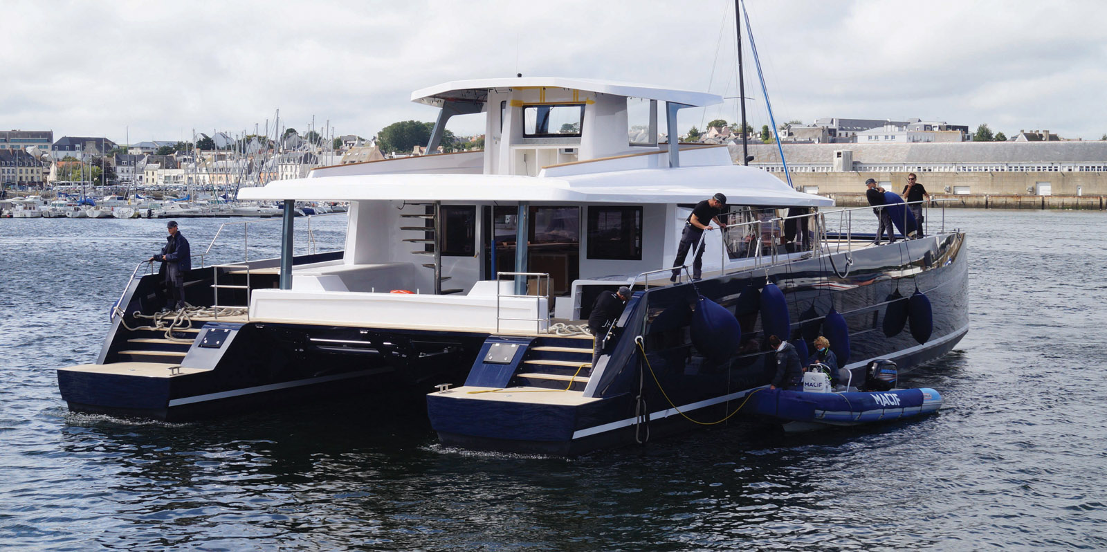 This catamaran in now in build: this model, the big sister to the Serenity 64, will be powered by solar energy thanks to its 110 m² of panels and two electric motors of 25 kW, or more traditionally by two 435 HP diesel engines. The cruising speed in electric mode will be 6 to 8 knots compared to 10 to 12 knots with internal combustion - expected peak speed is over 20 knots.