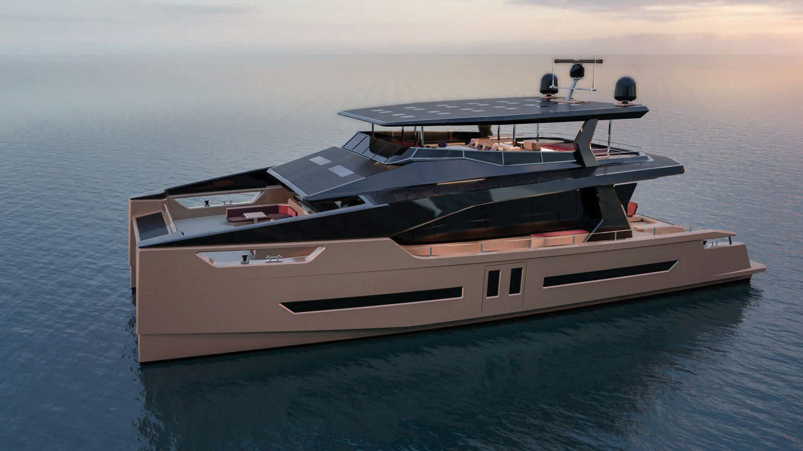 Designer T. E. Goffrier and the carbon gurus at Fast Forward Composites have already made a big splash with their very successful Eagle Class 53 – elected Multihull of The Year 2020 in the over 50-foot category. They’re going even further with this logistical support catamaran project. This category of vessel is in ever-increasing demand: it’s a question of managing and transporting anything that could “clutter up” the main yacht - such as a helicopter, a small sailboat or any equipment. The main original feature of this design are the socalled SWATH hulls: the raised platform is only connected to the underwater hull in certain places. The Switch Blade is 150 feet (45.5 m) in length and 50 feet (15 m) in the beam. The deck offers a surface area of 2,555 sq ft (237.5 m²). There is also a saloon/dining room of 1,830 sq ft (170 m²) that can open out to the sea, and a superb bridge measuring 1,570 sq ft (146 m²). Switch Blade is equipped with a hybrid propulsion system and more than 2,150 sq ft (200 m²) of solar panels.