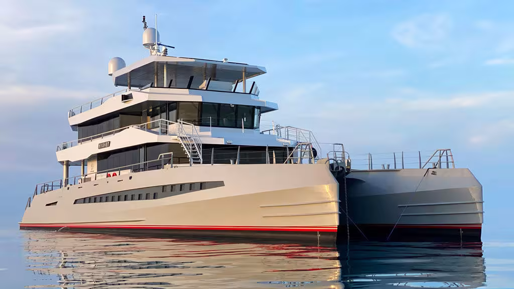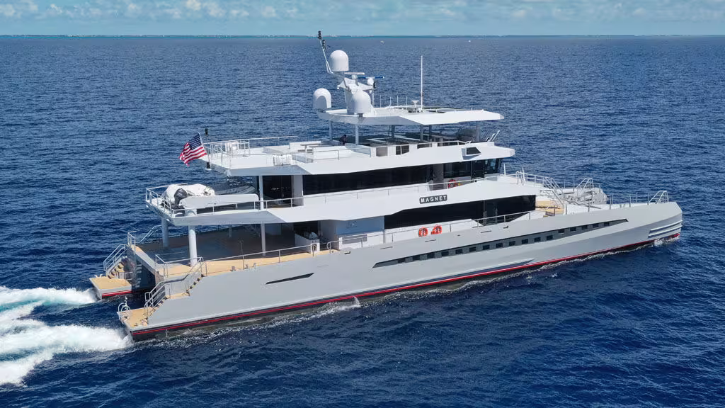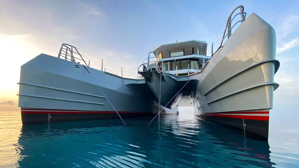 Usually, these units are intended for professional use, but the shipyard is now working on a new range of expedition powercats - the M30, M48 and M70. The M48 is the one that’s just been launched (September 23rd), making this catamaran the very first yacht to be built by the shipyard. The hull shapes designed by Incat Crowther are optimized for maximum speed and range: 27 knots at top speed, and a range of 11,000 miles at 10 knots! The design makes a nod to military vessels, but comfort is well and truly on board: nearly 4,300 sq ft (400 m²) of living space is available to the crew...