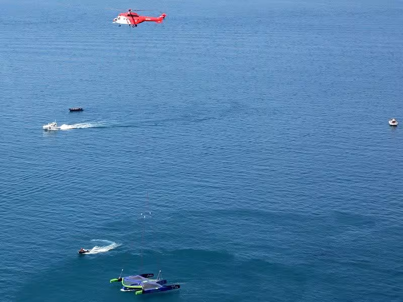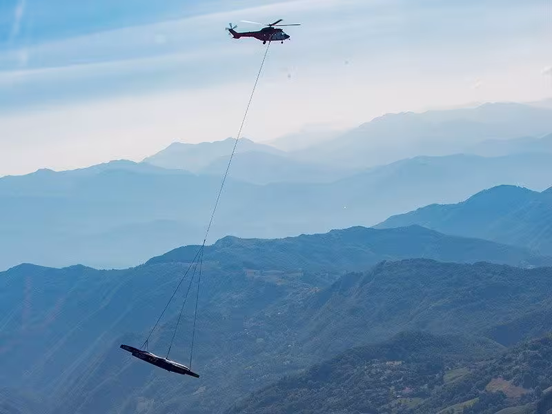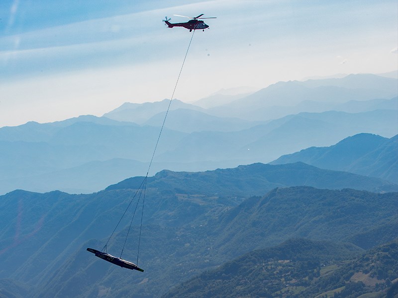 It was a far from simple operation: the three hulls – 50 feet (15.24 m) in length, and the same in beam, and 5,500 lbs (2.5 tonnes) in weight - had to be transported from Nembro, north-east of Bergamo (Italy) to Marina di Carrara, 6 mi (10 km) south-east of La Spezia. As the crow flies, that’s 93 mi (150 km) and one mountain range to cross. With the speed being (very) limited, flight time was estimated at around three hours. A significant amount of transport time which, when added to the need to climb to altitude, prompted Heliswiss International to plan to refuel their AS 332 Super Puma helicopter at the foot of the Apennine Mountains before overflying them.