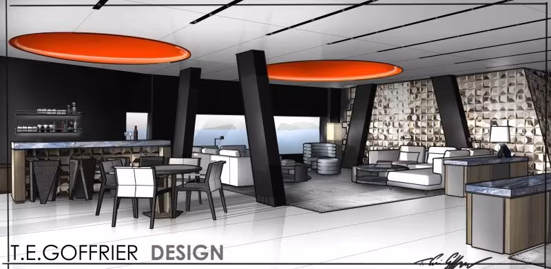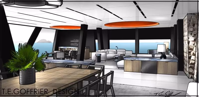 Designer T. E. Goffrier and the carbon gurus at Fast Forward Composites have already made a big splash with their very successful Eagle Class 53 – elected Multihull of The Year 2020 in the over 50-foot category. They're going even further with this logistical support catamaran project. This category of vessel is in ever-increasing demand: it’s a question of managing and transporting anything that could “clutter up” the main yacht - such as a helicopter, a small sailboat or any equipment. The main original feature of this design are the so-called SWATH hulls: the raised platform is only connected to the underwater hull in certain places. The Switch Blade is 150 feet (45.5 m) in length and 50 feet (15 m) in the beam. The deck offers a surface area of 2,555 sq ft (237.5 m²). There is also a saloon/dining room of 1,830 sq ft (170 m²) that can open out to the sea, and a superb bridge measuring 1,570 sq ft (146 m²). Switch Blade is equipped with a hybrid propulsion system and more than 2,150 sq ft (200 m²) of solar panels.