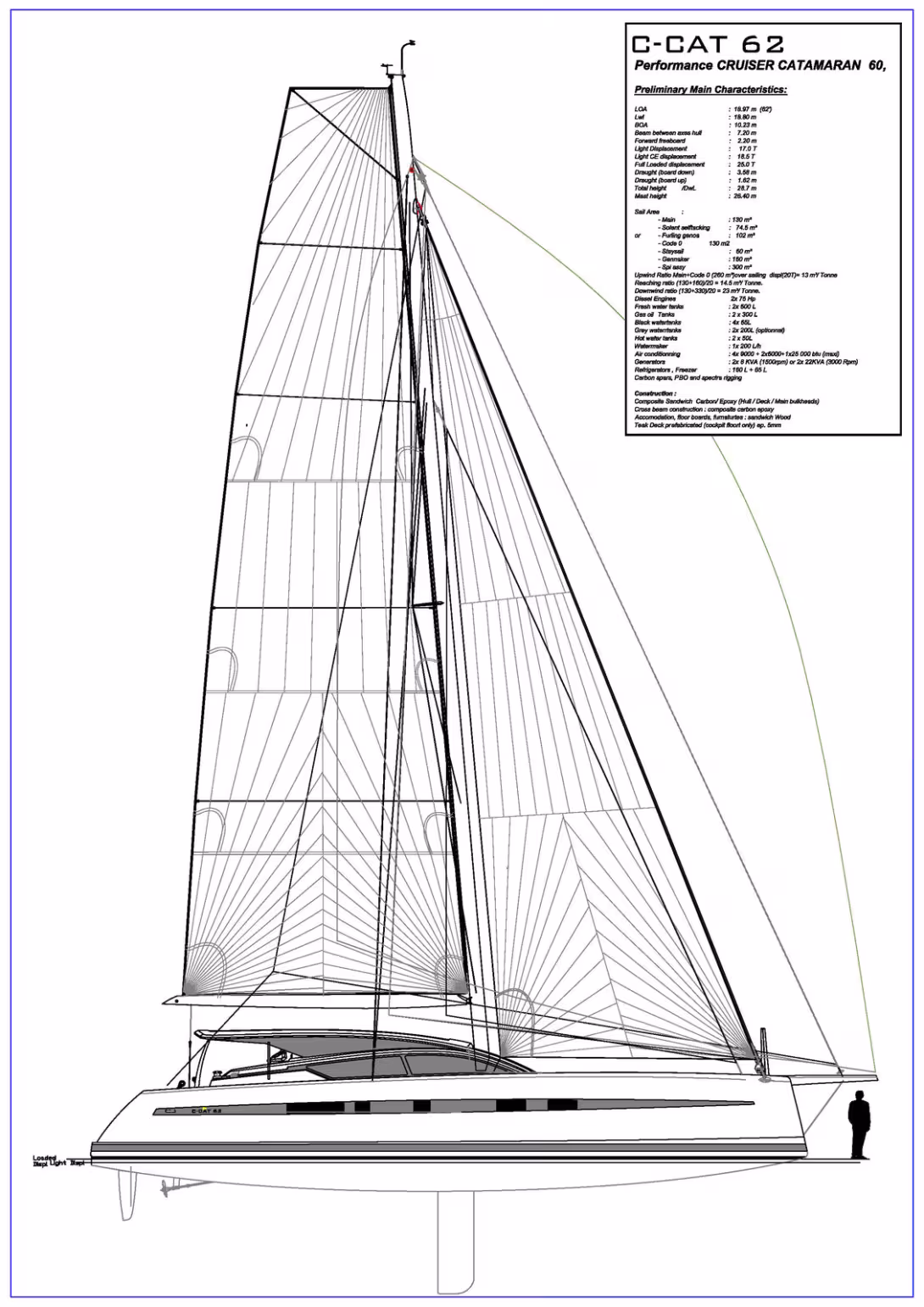 While their smaller model is forging a path in a market little exploited by the big builders, this next C-Cat 62 will be facing models that are already well-established in the sector of high performance, top of the range catamarans over 60 feet - Catana, HH, Icecat, Kinetic, McConaghy, O Yachts. It looks as though the project is being well carried out judging by the very attractive design - the two-tone coachroof and the design of the hatches are particularly successful. The sleek deck plan manages to reconcile sail maneuvering, ease of moving around on board and space for relaxation. The two raised helm stations and the retractable door also look great. The overhead hatches in the saloon will bring in a lot of light, and they fit into a slight reveal, helping to protect them under the tropical sun from ageing of the seals, which are highly exposed to UV rays, and the expansion of the glazing. Inside, the manufacturer is proposing from 3 to 5 cabins and numerous customizations, at the request of the client. With her 14-ton displacement for 222 m² (2,390 sq ft) of upwind sail area, the C-Cat 62 has a sail area /weight ratio comparable to that of a Gunboat. A guarantee of lining up 350 to 400-mile days under the trade winds...