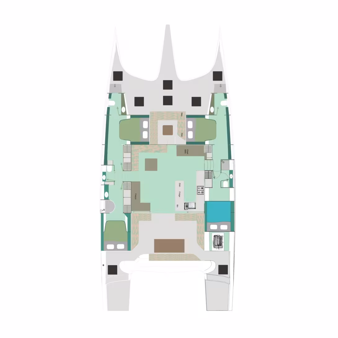 After two years of sea trials, the builder has validated the original “Smart Hybrid” powertrain. In other words, an electric engine in one hull, a diesel engine in the other. The idea is to take advantage of all the benefits of electric propulsion - no pollution, no noise pollution, the possibility of sailing in protected areas - and of the longer offshore range guaranteed by the diesel propulsion. The fineness of the hulls, combined with a displacement of 11.5t (25,350 lbs), ready to sail, thanks to the composite/carbon construction, allows for minimal consumption: one liter (just over ¼ US gallon) per nautical mile at 10 knots! To achieve this spectacular result, the yard's team opted, to port, for a large-displacement diesel motor (3.4 l minimum) whose power is exploited at low revs thanks to a variable-pitch propeller with large blades. As for the electrical system, to starboard, this was entrusted to OceanVolt with a 15 kW motor coupled to a 19 kW lithium battery pack. A “Full Electric” version will also be available. All sorts of customization are possible: solar panels, a rig with a short mast, kite wings etc. Professional-use versions suitable for diving, for hotels or even expeditions are also included in the Latvian yard's catalogue.