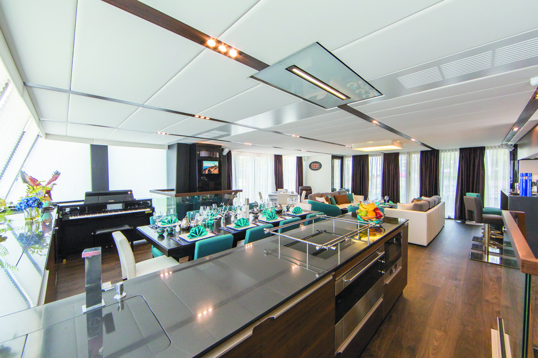 Seen from the side, you’d swear that this was a motorboat like any other... but the view from ahead or astern, highlights the tunnel - very high - that clearly separates the two hulls. With fine-entry bows and well-designed hulls, the V930 S2 is at ease at both 10 and 40 knots and can handle rough water. The layout - cockpit, helm station and galley are of course all on the same level. The 930 is available in an Open version.