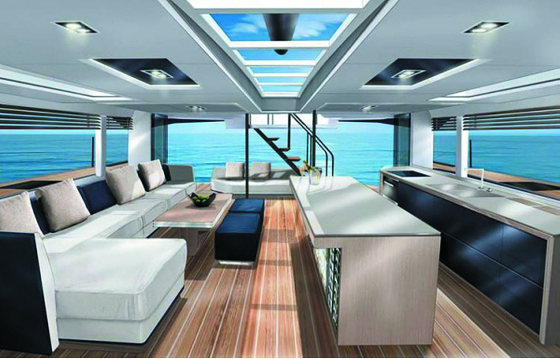 This characteristic catamaran range with its angular design is available in both sailboats and motoryachts - but it is the latter that is really targeted by the concept. Everything has been optimized to obtain record living space including a main deck and a flybridge of 65 m² (700 sq ft) each. The interior can be fitted out to suit your requests and without any constraints, as the volumes are similar to those of a house. The layout makes it possible to have the largest living space in the category in this size, then to decorate it as you like, assisted by the interior design studio set up by the yard. The 6 x 6 m (20’ x 20’) garage can accommodate all kinds of watersports toys...