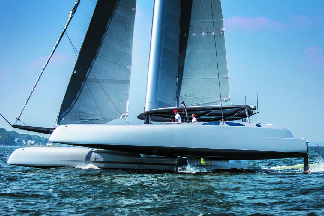 After a long period of development since last spring, the Eagle Class 53 caused a sensation at this year’s Annapolis Boat Show... and rightly so: with this extraordinary catamaran, the American shipyard Fast Forward Composites meets the specifications of an enlightened amateur and has conquered the developments of the flying-tightrope catamarans of the last America's Cup. In terms of innovations: The Hybrid Wing, a rigid semi-wing, developed by Randy Smith - this is composed of an initial carbon profile rotating 360 degrees and a fully-battened mainsail. Foils are of course on the list. To remain light, the facilities are in line with aeronautical standards. During our test in Rhode Island - to be published soon - Gwen Dorning (almost) got the machine in the air for us!