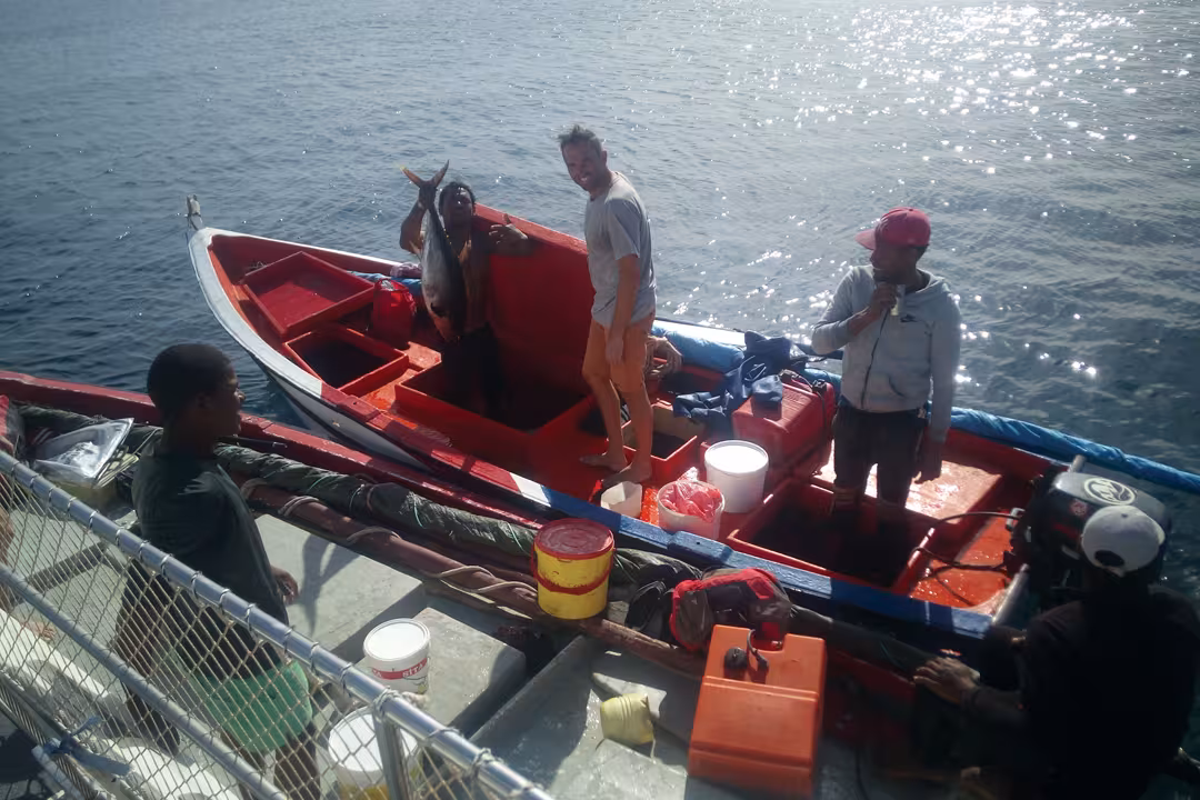 After Sal, we arrived in front of something that looks like an oasis in the hollow of the mountains. The next morning the men left to go underwater fishing; they were accompanied by Francisco, a 28-year-old Cape Verdean. He is a professional fisherman, and therefore was a great help in filling up the big bowl we took on the dinghy. The men returned with big smiles, and posed proudly with their day’s catch. I was very happy, I even had a lobster just for me – life’s good, isn’t it? At Tarrafal, we prepared our Christmas meal; along with our ‘boat buddies’, we’ve shared our recipe ideas; everyone would cook on their own boat, and we would raft up two catamarans for greater comfort – one for the adults and one for the kids. Another morning, our captains abandoned their vessels well before dawn to go fishing with Francisco and his brother. It’s incredible how, with very little they can manage so well – a garden tarp as a sail, a long piece of wood to make a mast, an old bleach container filled with water to drink, no GPS - surprising! The fishermen brought our men back and as a bonus gave us some fresh tuna. We were anchored off a new Tarrafal, on the island of Santa Antao. Some men were hard at work building, others were constructing a new fishing boat, and we found all the women at the water distribution point. The children accompanied them, some of them came alone and left with their water containers on their head, all smiles! At the end of the day, the fishermen came back to meet us and gave us some more fish; they asked us about our voyage, life aboard, schoolwork. It was time to leave for the first big ocean crossing. We loved Cape Verde for its authenticity, the kindness of its inhabitants, their generosity, as well as the abundance of fish.