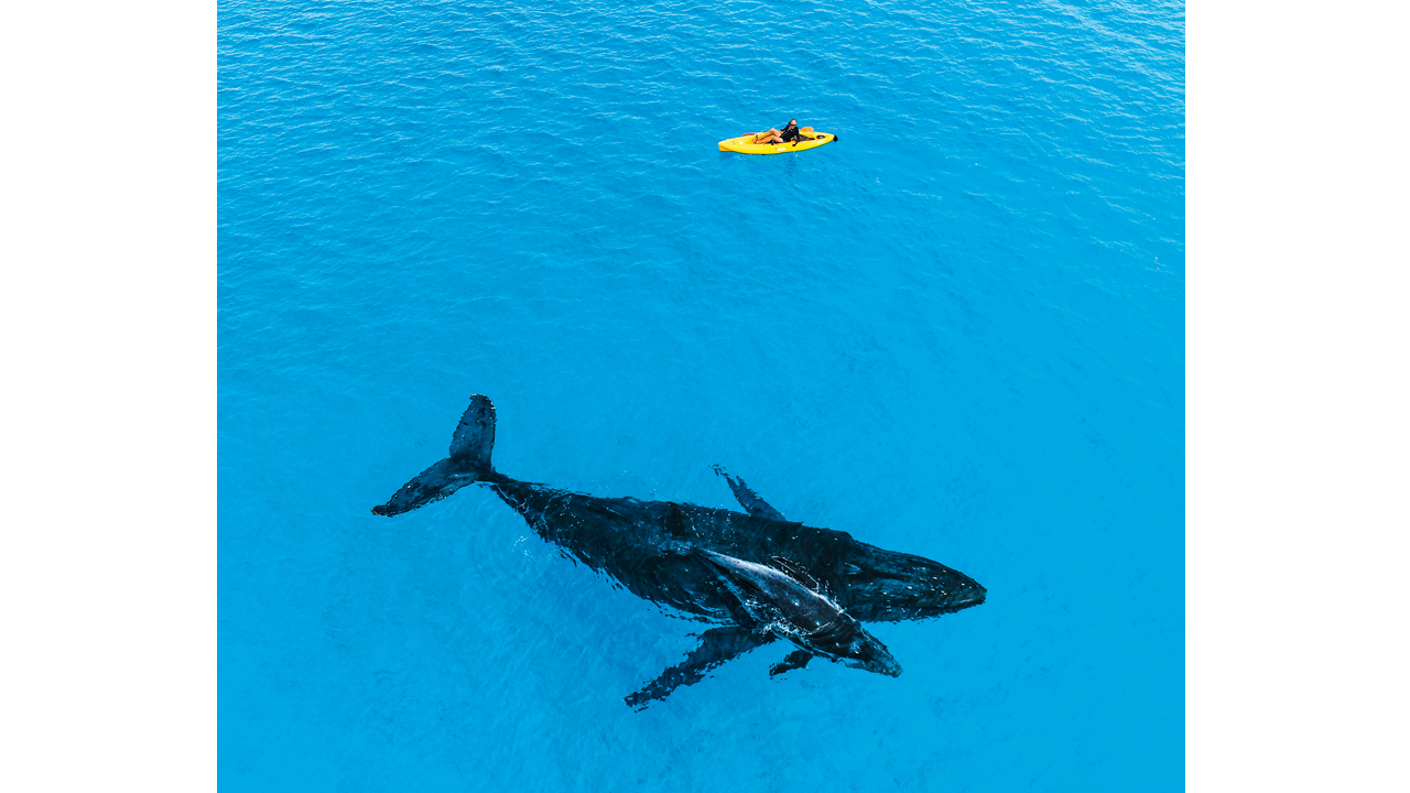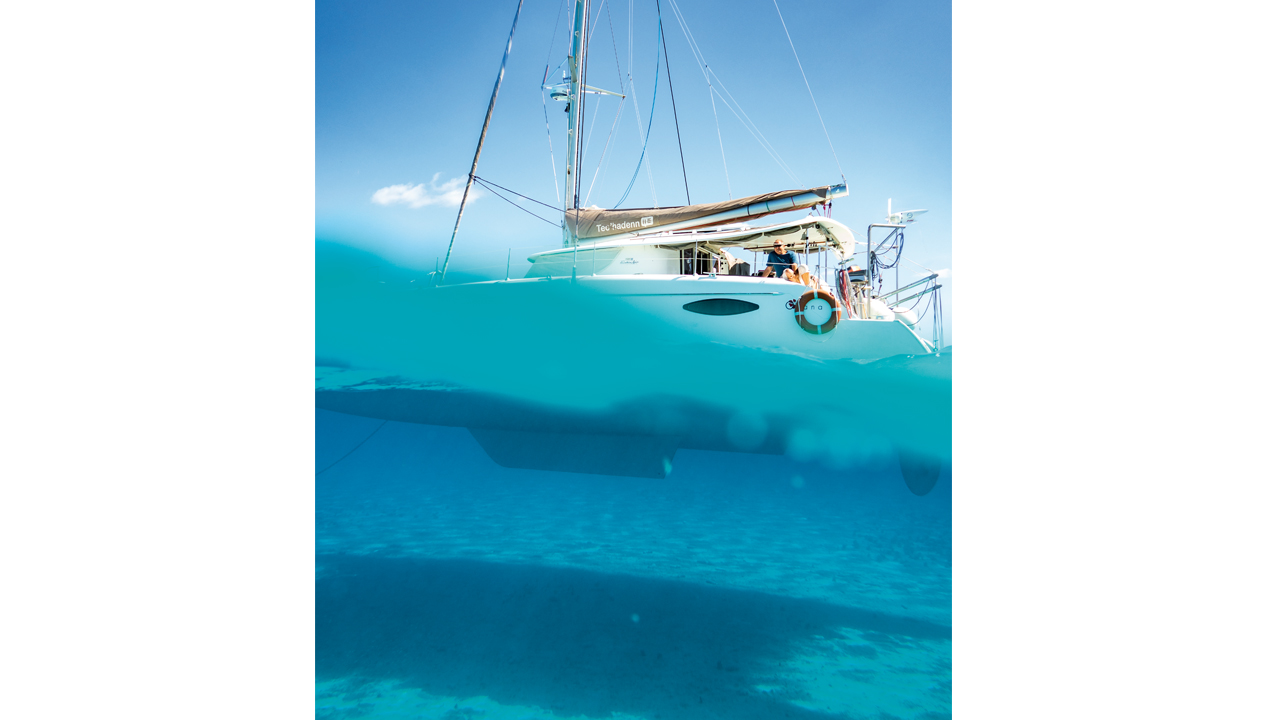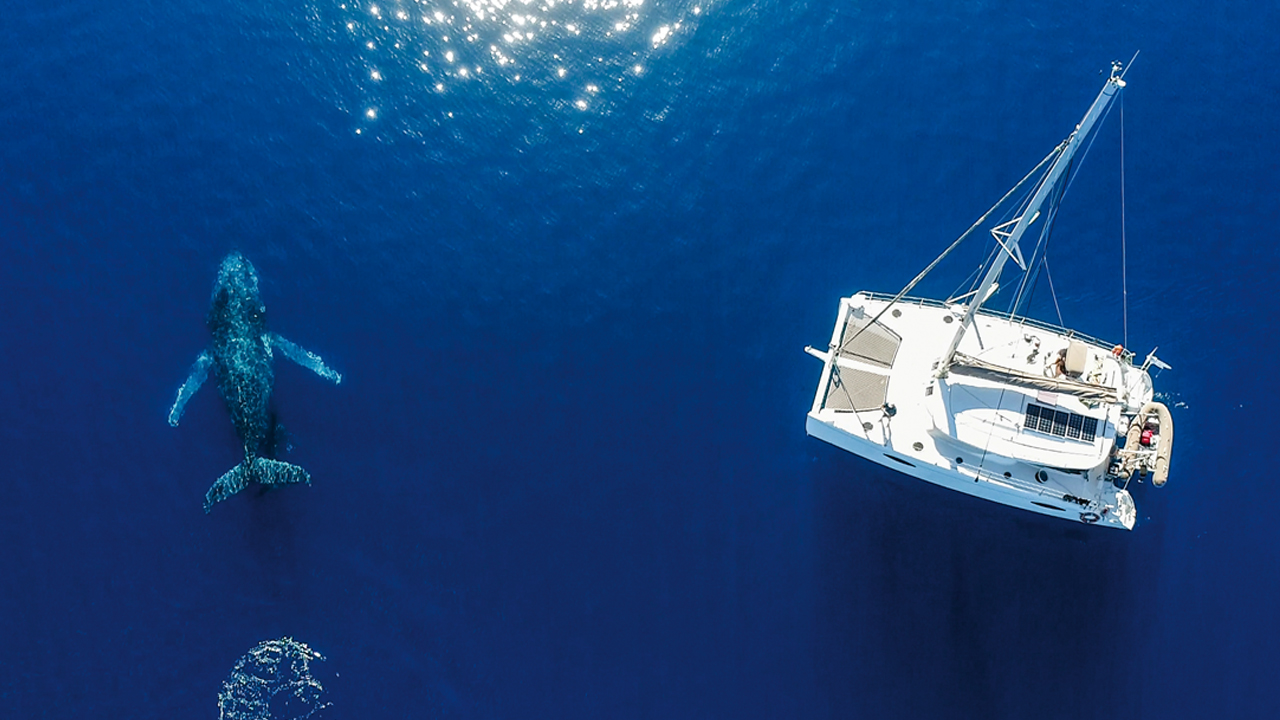 They were swimming slowly in around 15 meters of water, close to the catamaran’s sugarscoops. Overexcited, we jumped into the dinghy to get over to them, and I prepared to get into the water. I suddenly saw them through my mask, a mother and her calf. The two dark objects came closer, startled by my presence. With a quick spin, the mother showed me her perfectly white belly. The youngster seemed to wink at me. One flick of the tale and I ended up tens of meters away. We followed them for a while with the dinghy before letting them head away.