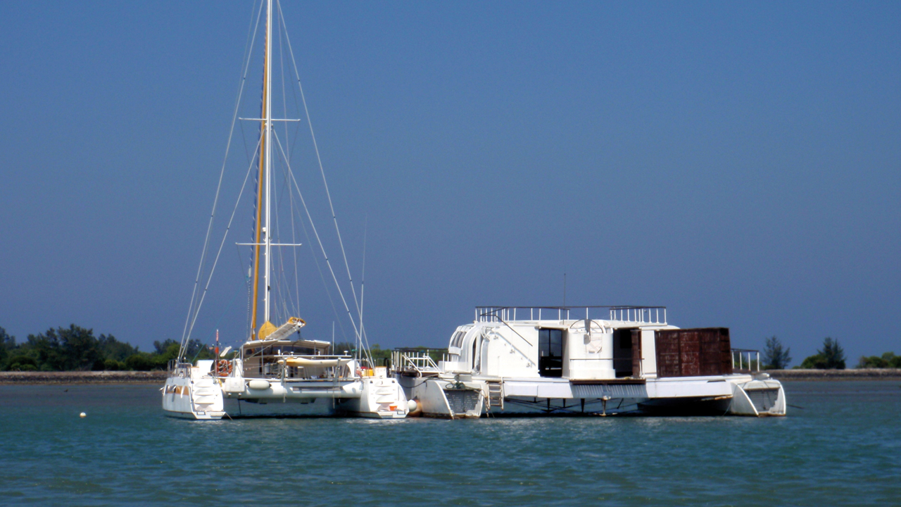 As we headed into the pass, the banks of coral broke up the water and it calmed down again. Xavier, who works with an Ocean Voyager Fast 62 catamaran, (built in the shipyard that I used to be in charge of not that long ago), came over in a Zodiac. He guided us to a rather unusual mooring: alongside a great big floating wreck. A big catamaran, with no mast, which must be the result of major architectural and construction errors. It was an ideal spot for us. Like Jangada’s own personal giant dinghy, which the children would soon colonize…