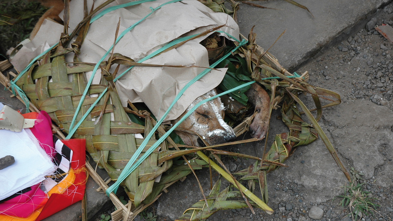 Of course the animal sacrifices are the rites which impact us westerners the most. From the sacrificed dog to the duck thrown in the sea with its feet tied so that it gently drowns after desperately trying to save itself, or the pig cut into fine strips of lard decorated with red chilies and the complex fruit and vegetable figurines, Balinese Hinduism never ceases to amaze. Among other things, it’s down to the contrasts: on the one hand, a tolerant, welcoming people who accept you despite all their religious duties. On the other hand, a brutality which can lead to a duck being decapitated in the street and the blood sprayed around the family home… Religion is everywhere in Bali. There are temples in every village and shrines in every field. Every morning, the Balinese place their offerings for the good spirits, and leave other ones around to calm the evil spirits. Every morning when we arrived on the pontoon, we were sure to find the offerings left by the night watchman at first light. This graceful and aesthetic ritual is practiced throughout the island. Almost every village has at least three temples : the most important one, the the Pura Puseh, is dedicated to the founders of the village; the Pura Des Ais for the spirits that protect the daily life of the community and the Pura Dalem is the temple dedicated to the dead. Families honor their ancestors in their family temple, and their clan also has its own temple. Each village or clan has its own calendar for the various festivals, which meant that we were able to be present several times when there were preparations or processions taking part in various parts of the island. One of them was a ceremony on the beach at Tugu in the west.