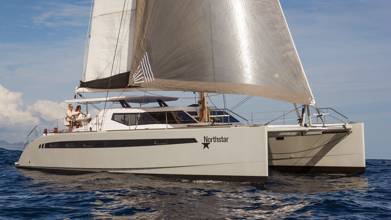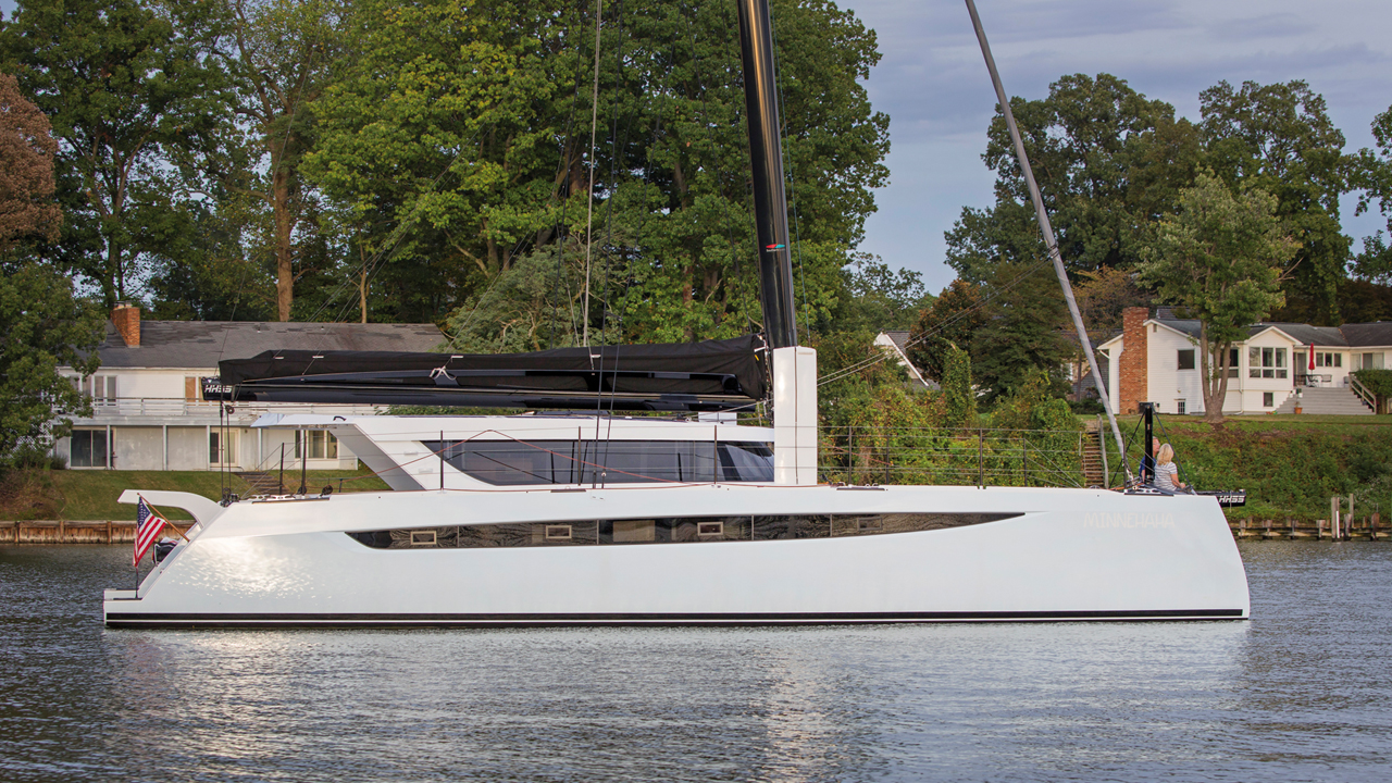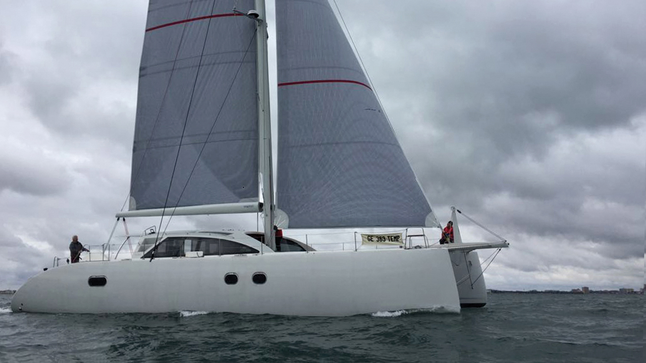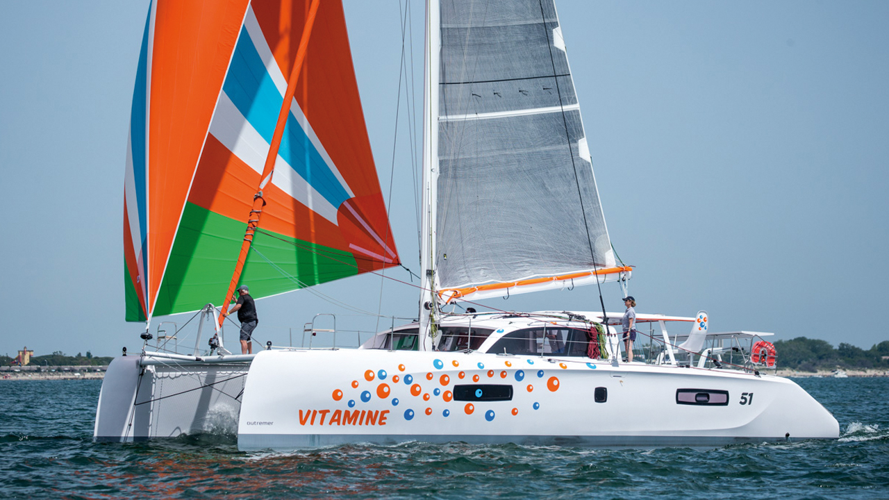 Hudson offer their high performance catamarans in a more reasonable version called the Ocean Series. If the sleek lines, thanks to the talented Morelli-Melvin design, remain the same, fiberglass replaces the carbon in the hulls. The mast and boom are in aluminum, and curved daggerboards give way to fixed skegs. With the quality and layout of the facilities, in three cabins, as on previous models, the OC 50 clearly fulfills the specifications of fast but stress-free offshore cruising. It features the unique raised helm station for a short-handed crew, where all the sail handling maneuvers are centralised.