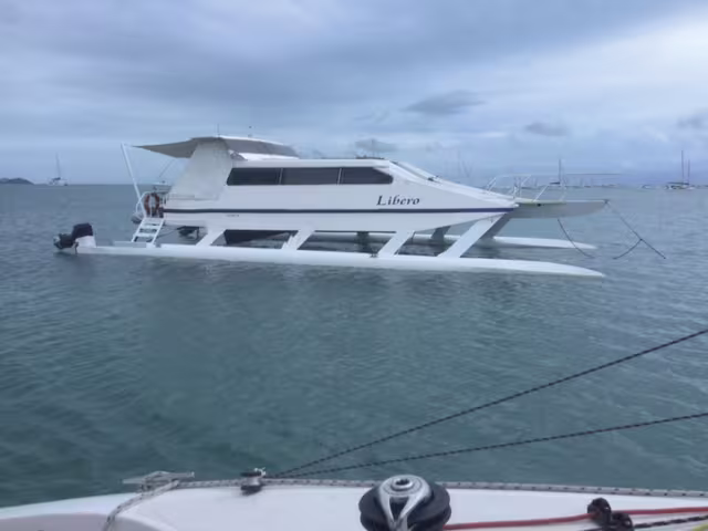 <p>Hello everyone. I hope you will appreciate this Australian catamaran which I saw in the anchorage at Airlie Beach, in the Whitsundays (Australia). I find it particularly intelligent that someone has dared to design such an original catamaran, so different from all the others. It must be French, of course! (or perhaps English? Who knows? – Ed).</p>