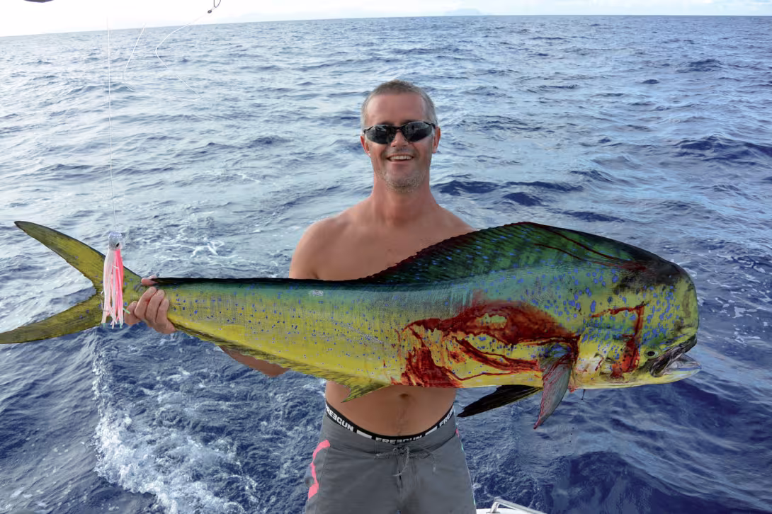 Scrubbing off finished, we put the boat back in the water so we could quickly take advantage of the few days of the February holidays that remained! After almost 4 months ashore, Maui was pleased to be back in the sea. We had taken on provisions so we could leave for Fatu Hiva, a day’s sail to reach this mythical place: the Baie des Vierges, where the village of Hanavave nestles. Suddenly the fishing rod started whistling, we landed a nice female dorado or mahi, then a moment later, it was the male’s turn to attack our lure. The fight was a bit harder. We stowed the rods, as we would have enough fish for the weekend. Fillet, steak, sashimi, a delight! Soon, Fatu Hiva was outlined in the distance. 630 inhabitants live here between the two villages of Hanavave and Omo’a, linked by the only road crossing. Provisions are brought by boat, as there is no airfield, the island is too hilly. Fatu Hiva is very impressive, with its peaks rising to over 1000 meters. People say it looks like a cathedral, especially the Baie des Vierges. The island receives copious amounts of rain, which gives birth to rich vegetation. The primary forest occupies almost all the area. The island lives off fishing, copra production, tourism and its crafts – there are some superb Tapa (beaten and painted wood sheet) to be found here. When the twilight sets the rocky peaks ablaze, the Baie des Vierges turns into a supernatural, unforgettable setting. It’s certainly one of the most beautiful bays in the world! Unfortunately the all too present north-westerly swell didn’t allow us to stay, and regretfully we were forced to set off again for Tahuata. We were alone in the world in this bay, a bit of snorkeling in the morning, when turtles, triggerfish, parrot fish etc. came to swim with us. It’s the end of the holidays, we have to return to Atuona, there’s school tomorrow!