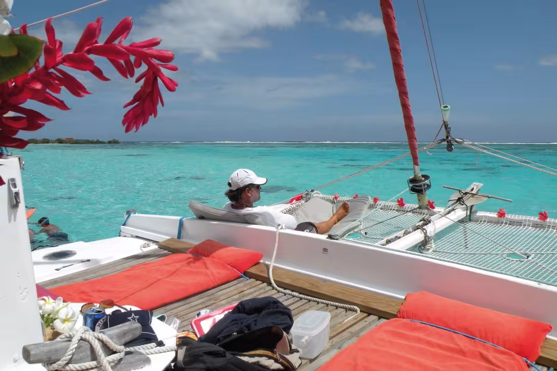 Everything began four years ago, when I bought Taboo, a Wharram-designed Tiki 30 built in England in 1998. Its first owner had crossed the North Atlantic with it, to the United States. There it was sold, before a new aficionado chose it, and sailed to where surfing was born, and where some of the most beautiful waves in the world are to be found: Polynesia. I bought Taboo two years ago. It was suffering from a serious lack of maintenance, so I set about restoring it. Moorea, a few miles from Tahiti (moreover it is called ‘the sister island’), is like a summary of Polynesia: the island is surrounded by a coral barrier, just like in the Tuamotus, which provides a perfectly protected lagoon. But it is also a high island, like Tahiti or the Marquesas, dominated by Mont Rotui. The playground is unique, whether inside or outside the passes, most days you will meet a manta or blue spotted ray, a pod of dolphins, or even when it’s the season, between June and October, one of the numerous hump-backed whales which then pass through Polynesia. Certain bold people even succeed in swimming in their company, without approaching too close or disturbing them. And if they decide to, then the whales will come and frolic with you. Excitement guaranteed!