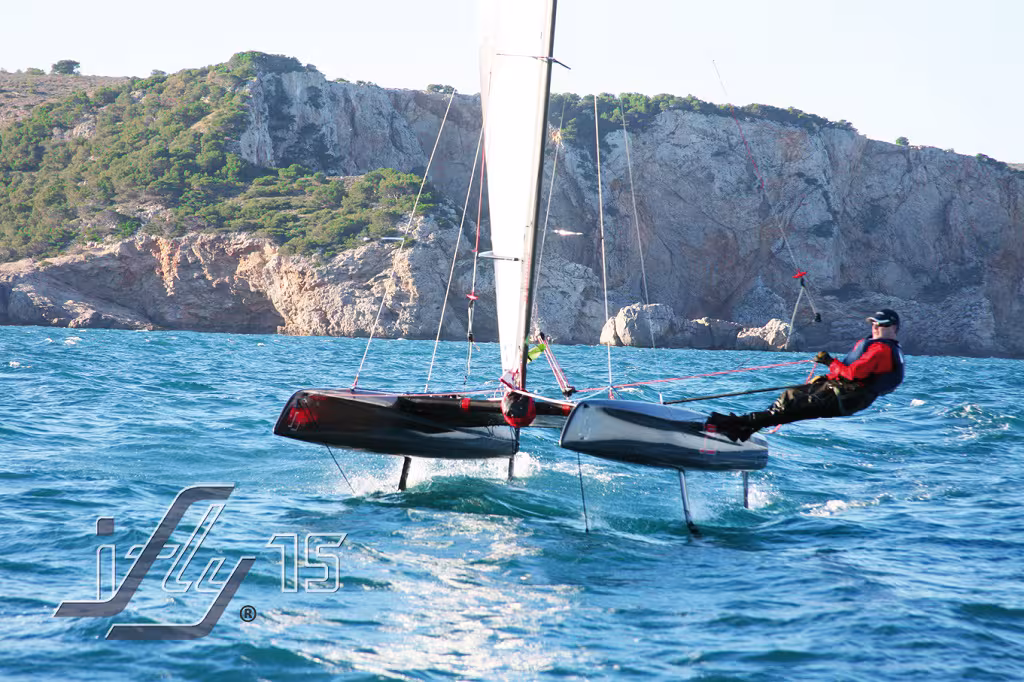Ifly 15 is a catamaran equipped with automatic foils to stabilize the horizontal trim in the longitudinal and transverse directions, and gybes are made easier by the 4 T-shaped foils which are always in the water and stabilize the boat.