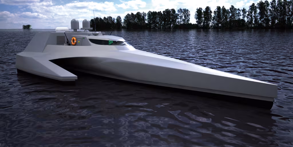 This is in fact a trimaran, with a narrow hull and two floats situated aft allowing it to offer a nice platform which can thus embark drones, RIBs and other mission modules. 29 meters long, it is capable of a top speed of 40 knots.