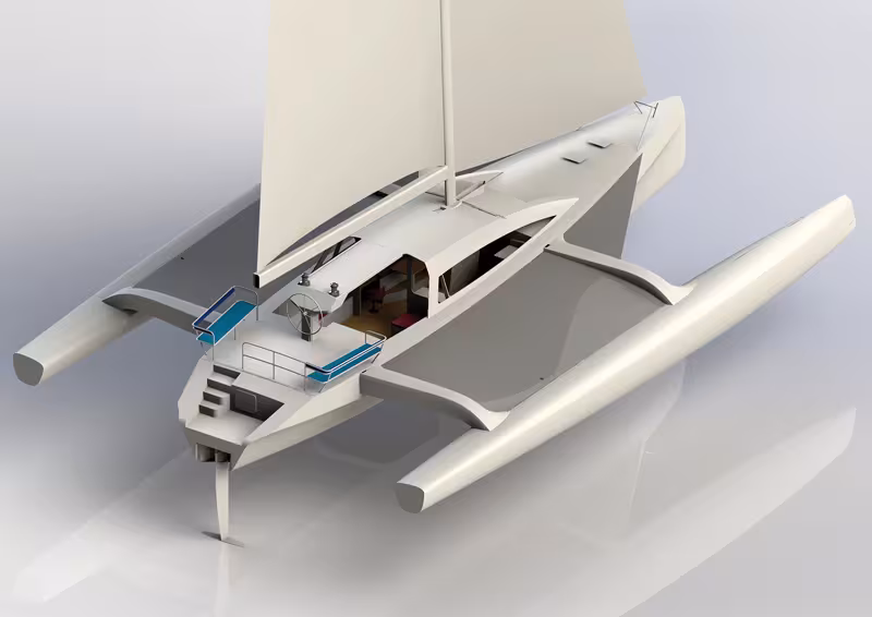 At the origin of the project is Paul Koch, who has designed, built, sailed and raced trimarans for 25 years (notably the Corsair trimarans), and who wanted a blue-water cruising boat with space to live, but offering all the trimaran’s advantages in terms of performance and comfort at sea. The result is here, with the Rapido 60 trimaran. Unsinkable, offering a nice living area aboard (with berths for 8) and a luxurious saloon, the trimaran is built using infusion, to maintain the weight specifications. It has been designed to be easy to manage single or short-handed, even though it should be capable of reaching 25 knots.