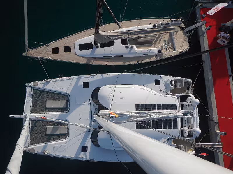 This is how the Swan 60 and the Ocean Explorer C-60 catamaran came to be designed by Germán Frers. In the anchorage at Port Adirano, the skipper of the catamaran which was rafted up with the Swan, didn’t hesitate for a second to climb up the mast and take this original photo between these two boats with a recognized relationship. A photo which shows the incredible amount of space the catamaran offers, compared to a monohull of the same size...
