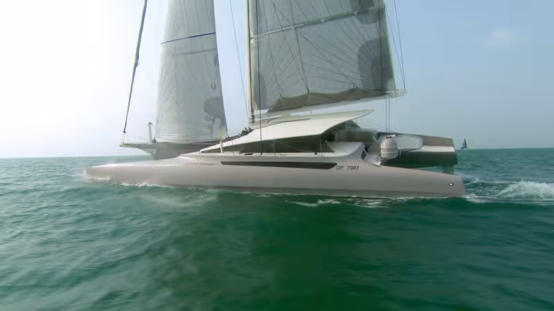 The GT Cat 66 has just been launched in Dubai, and the first pictures are definitely impressive... Designed by Nigel Irens and Benoît Cabaret, the GT Cat 66 is advertised as weighing 11.5 tonnes unladen, with 325 m² of canvas and is supposed to fly a hull in 12 knots of wind and above!