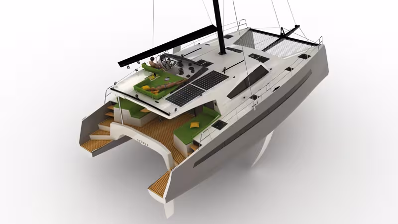 This is a comfortable, luxurious catamaran with a programme of long-term cruising in the sun, which explains the choice of a wide opening between the interior and the exterior. Built in Sealium, this 12.9-metre boat shouldn’t weigh more than 9 tonnes, with a sail area of 104m².