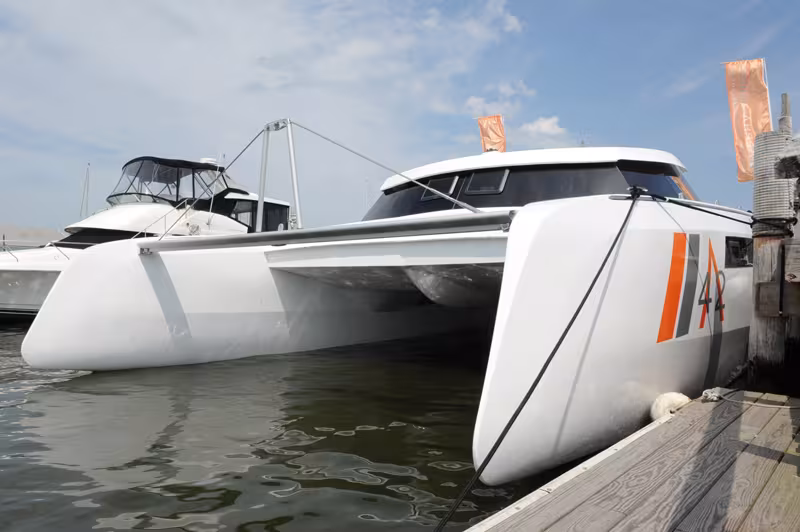 This catamaran, thought up by Gregor Tarjan from Aeroyacht, one of the multihull specialists in the United States, positions itself in the niche of cruising boats which are easy to handle shorthanded, offer real pleasure at the helm and have good performance.There is no doubt that with its rotating carbon mast, its nice sails by North and its reasonable weight for a cruising cat (9.2 tonnes unladen), the nice hull designed by Marc Anassis NA and its wave-piercing bows it succeeds in its wager of appealing to blue water cruisers.