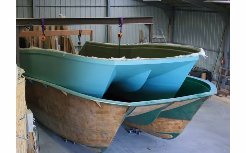 The very first hull has only just been taken out of its mould. The 9.5-metre cat will be propelled by 2 x 200hp engines, and both the deck plan and the ‘accommodation’ will be ‘a la carte’, according to each owner’s needs.