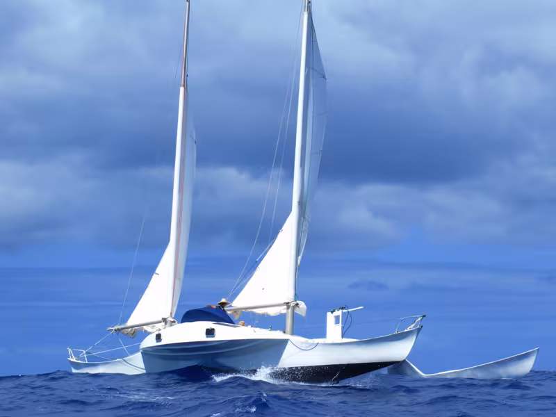 Well, it's been done! This legendary racing boat, which is above all the last representative of the big racing proas (all the others have disappeared...), has just returned by sea from St Martin in the West Indies to the Balearics, its new home port, with, if you please, the trimaran VSD (ex Riguidel) as an accompanying boat. A very nice story which we will tell you very soon in Multihulls World.