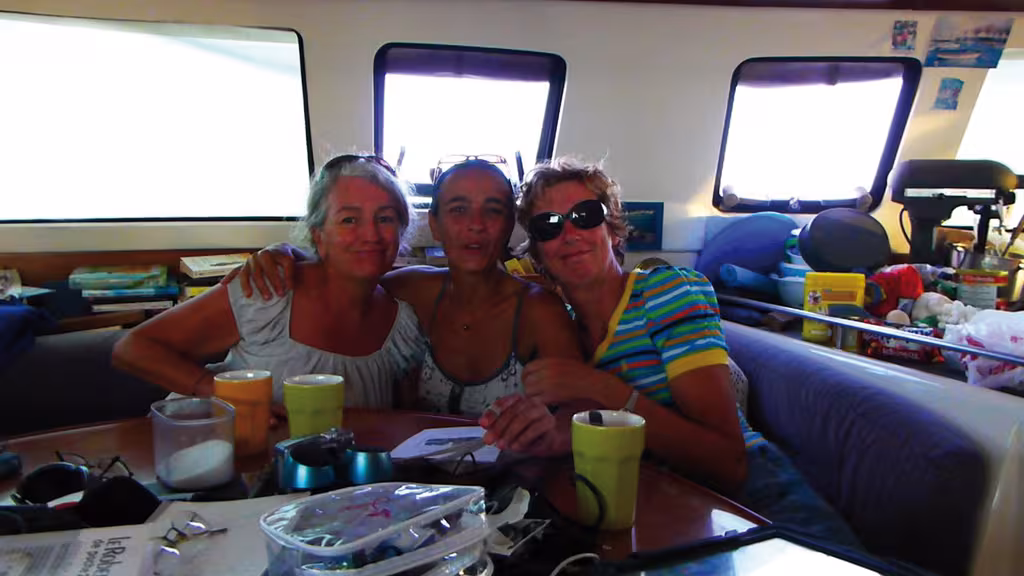 They aren't women sailors in the sporting sense of the word. They also aren't just any old crew member, rather travelling companions who will do just about anything to preserve their holidaying lifestyle, alongside a sailor who is often as content as...a fish in water. There are obviously exceptions. I can think of two women who any sailor would be pleased to have on board, but who, through their gentleness, simplicity and good humor are also great friends of women. Wow! They're young obviously and beautiful. One can fix a drive belt in an air chamber, the other climbs up the mast in a howling gale to replace a pulley. One cuts her husband's hair whilst dictating lessons to her three children; the other has a very young girl and a baby living with her on her ageing monohull! Of course they are both experts when it comes to sailing, engineering, electricity and plumbing. They should by rights annoy all women; however we are simply in awe of their prowess. However, the majority of female sailors don't have their fiery temperament or their skills. They have decided to follow the man they love. Most women hate the following: sailing at night, strong winds and big waves, long journeys, their sailor's grease-stained hands, choppy moorings and difficult disembarkations in dinghies. On the other hand, they tend to enjoy: gentle sailing; calm moorings on clear, lagoon waters; stopovers and island visits, meeting other people and sharing experiences; breakfasting with a sea view and communicating with children and parents via internet. We meet like-minded people and form new friendships. I've also had the chance to talk to female lawyers, judges, fashion designers and vets. A range of people who on terra firma, would perhaps not have or find the time to chat for hours in the bakery! Wherever we come from, our age or where we have lived, we have some things in common: the love of our husbands, the diversity of our new discoveries, daily life on board with all of its good ideas and ingenious solutions. After weeks or months spent by each other's side, the end of the journey always comes around too quickly! If your man suggests one day that you should cast off together, do as I do: quickly pack a few suitcases, (not forgetting a good hair remover) and follow him: you won't regret it!"