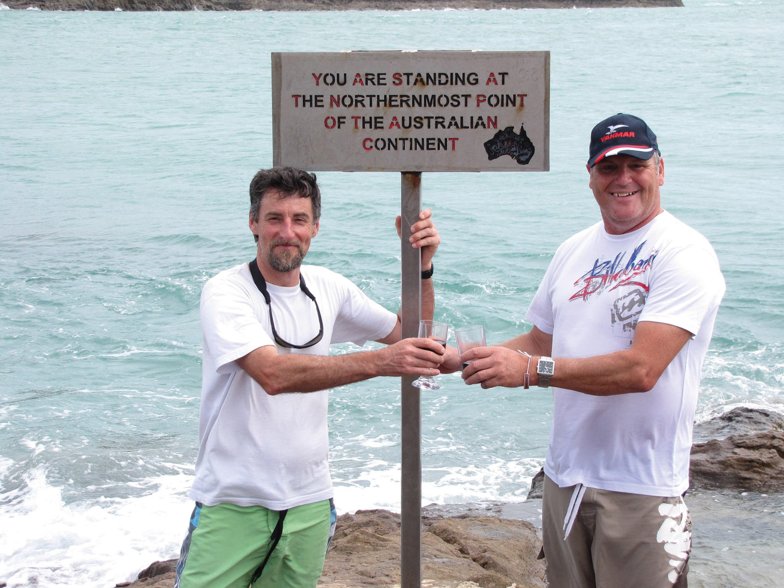 Here at Cape York, Australia’s closest point to the equator (10° 41’ S 142° 31’ E). Mission accomplished for skipper Royce(L) and first mate, author of this article!