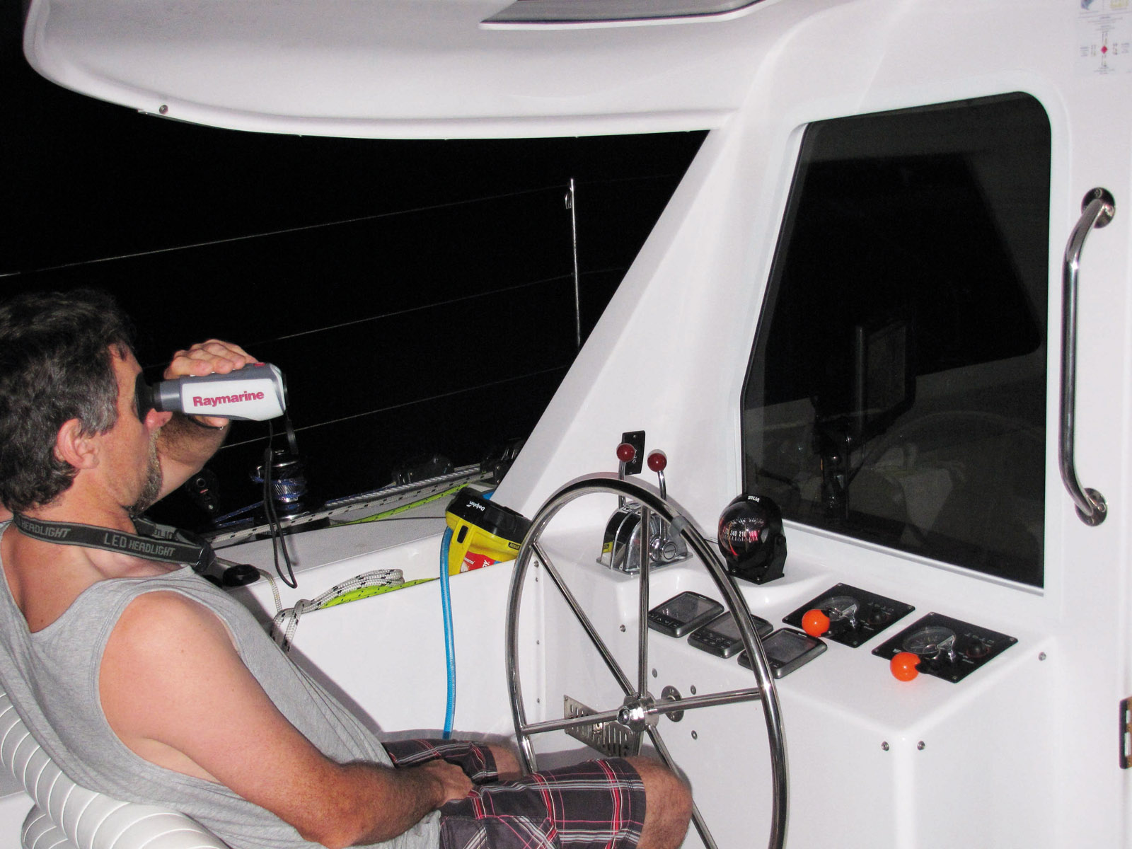 Using the night-sight helped Kevin entering anchorages... and spotting crocs.