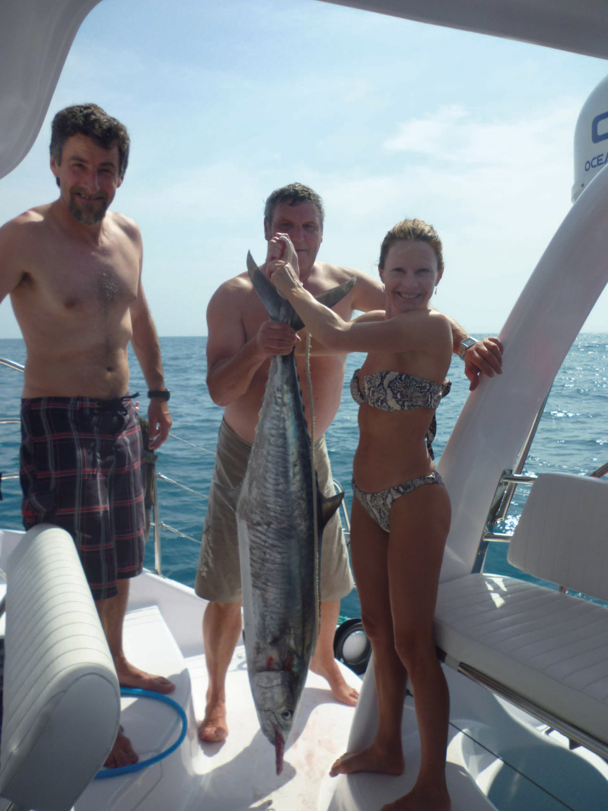 A happy crew having landed a 35 lb (16kg) Spanish mackerel on a towed lure; we also landed some bluefin tuna as well.