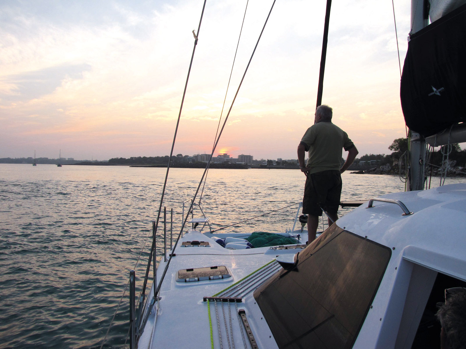 Sailing west for two tranquil days with light winds brought us to our last major obstacle before Darwin, the Coburg Peninsula and Port Essington, where the early British settlers had attempted to establish a township. After anchoring and going out in the dinghy I had reached for our only weapon, a small axe, as a crocodile much larger than us approached, but thankfully, swam by without attacking. Another two days of enjoyable sailing followed, as our catamaran effortlessly slid along in the light tropical airs to reach Darwin. Nearing the populous center of some 130,000 inhabitants, we could smell the spicy mix of city life and see its faint glow, yet still only a mere dot of light on this wild coast...