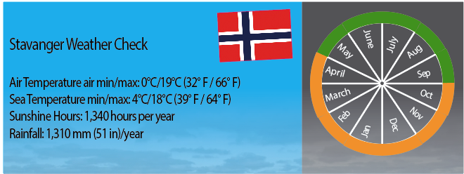 From mid-May to the end of August, sailing conditions become ideal even if the weather is changeable. It’s usually quite cloudy and the water is cool (18°C / 64° F maximum). It can be hot - the heat record is 34.2°C (93.5° F) - but the nights are generally cool with average lows of 12°C (54° F) in July and August. Being on the water in Stavanger during the summer solstice (June 21) is something of a privilege: you’ll enjoy a 4.24 am sunrise and a 10.53 pm sunset - that’s almost 18.5 hours of daylight. From May 16th to July 27th, it is the time of all-nighters, during which it never gets completely dark.