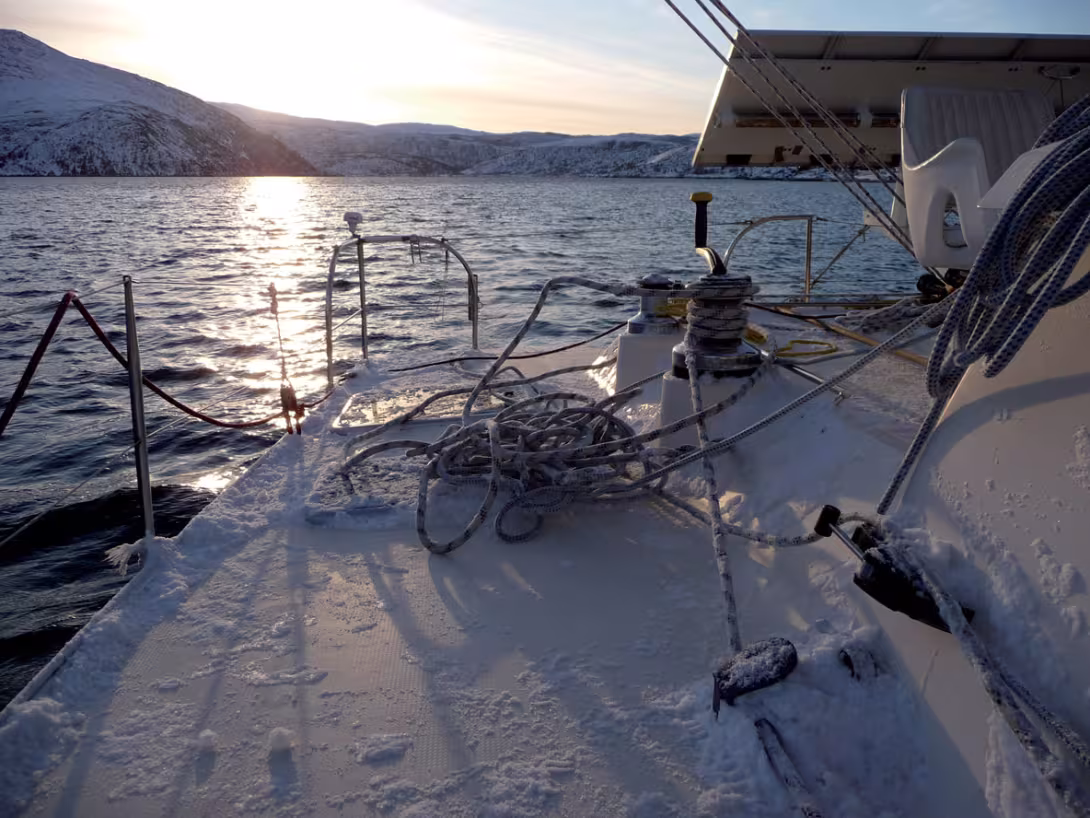 Contrary to popular belief, it is possible to sail all year round on the west coast of Norway, as the sea does not freeze. The Gulf Stream, passing north of Scotland, manages to warm up the North Sea significantly, as the water temperature in December and January remains at 4°C (30° F). The air temperature is cold in January (average minimum of 0°C / -32° F and maximum of 5°C / 41° F) but not really extreme, even if the coldest recorded temperature is -23°C (-9 ° F). Of course, it snows often, and the shortest days are hardly longer than 6 hours... In short, a winter trip should only be recommended for perfectly equipped and well heated multihulls.