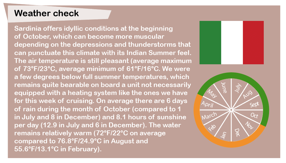 The next morning, we decided to sail close to the island since we had to pick up some friends who were landing in Olbia that evening. For this first day, we raised the anchor relatively late to sail around Isola Tavalora, a small mountainous island 3 mi/5 km long with a high point of 1,840 feet (560 m). The conditions were fair: clear skies with 15 knots of wind and gusts to 20-23 knots - enough to quickly get the hang of the catamaran under sail. Once the mainsail was hoisted and the headsail unfurled, it was time to cut the engines. Now let’s see how you sail upwind on such a vessel - I must admit, I was full of prejudices regarding cruising catamarans! To start with, I positioned myself at 65° to the apparent wind. However, I quickly realized that it is possible to get closer to the wind to reach an angle under 50° to the apparent wind and thus avoid tacking too squarely (even though we had quite a bit of leeway). This is the advantage of our little self-tacking jib... As for the speed, we were sailing at 5 knots, and it was difficult to do more. Once the autopilot was engaged, we could take full advantage of the space offered by this catamaran: almost 860 square feet (80 m²) for a 42-footer! Three tacks enabled us to leave the bay of Olbia, so we started to sail around the Isola Tavalora. We got a surprise when we arrived on the southern side of the island and discovered a totally different landscape with vertiginous cliffs plunging into the dark blue depths of the sea. There were clouds stuck to the summit, which made for a somewhat dramatic atmosphere. We arrived quietly downwind at the small, sheltered anchorage of Cala Girgolu where we had arranged to meet the rest of our crew that evening.