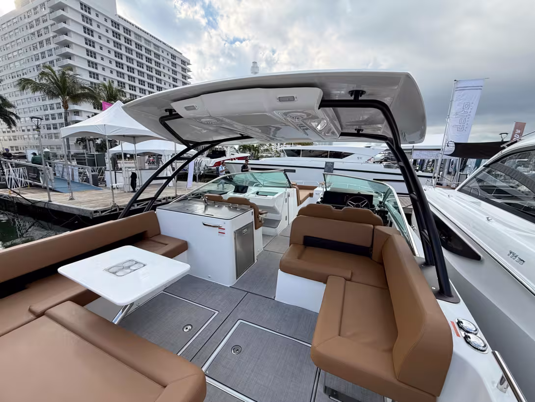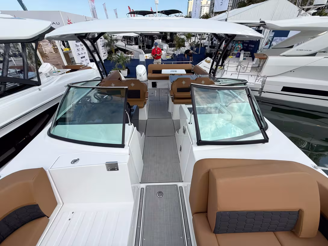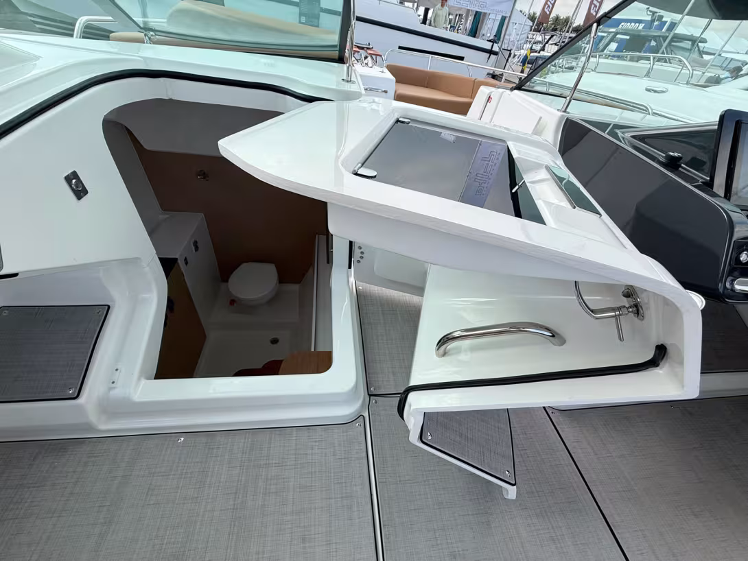 Au poste de pilotage, deux larges sièges face à la mer accueillent le barreur et un passager. Le pare-brise panoramique courbe peut être complété par un T-top. L'accès aisé au cockpit central et à la salle de bain facilite la circulation. La cuisine extérieure est équipée d'un évier, d'un réfrigérateur et d'un grill électrique en option. Au total, le pont offre 37 m² d'espace utilisable. Le vaste espace de rangement peut être transformé en une mini-cabine, accessible en retirant les coussins et en ouvrant une porte, bien que cette dernière gagnerait à être allégée. Les toilettes sont astucieusement séparées.