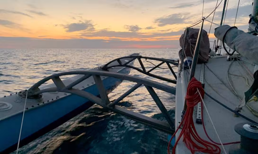 The floats, which are short at the after end, appear to be small in volume. They are supported by “Eiffel Tower” structure arms, somewhat reminiscent of those on Pen Duick 4.