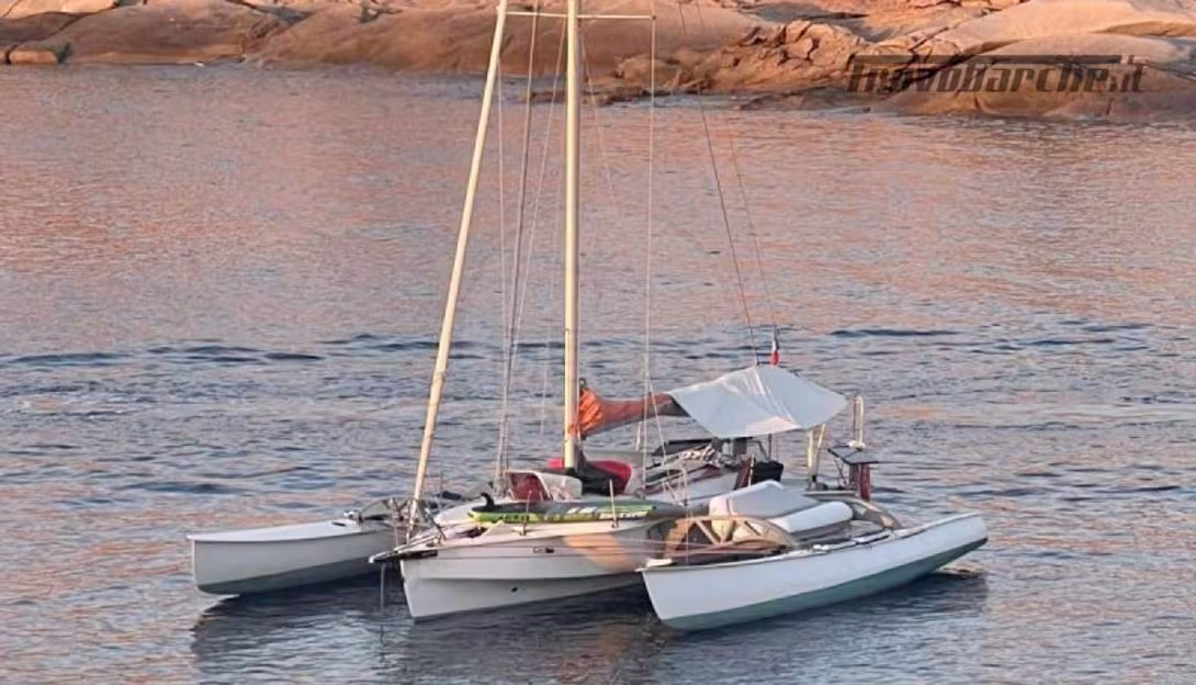 But getting back to the Mattia e Cecco T 11 - this Italian trimaran from the early 1980s is unfortunately not included in the list of some 600 multihulls we have tested, but we have managed to gather some information. This folding multihull is characterized by a widened “Leen-style” central hull deck, forward, but rounded at the stern. Closer to the waterline, there is a marked chine, allowing for maintaining a remarkably narrow central hull at the waterline.