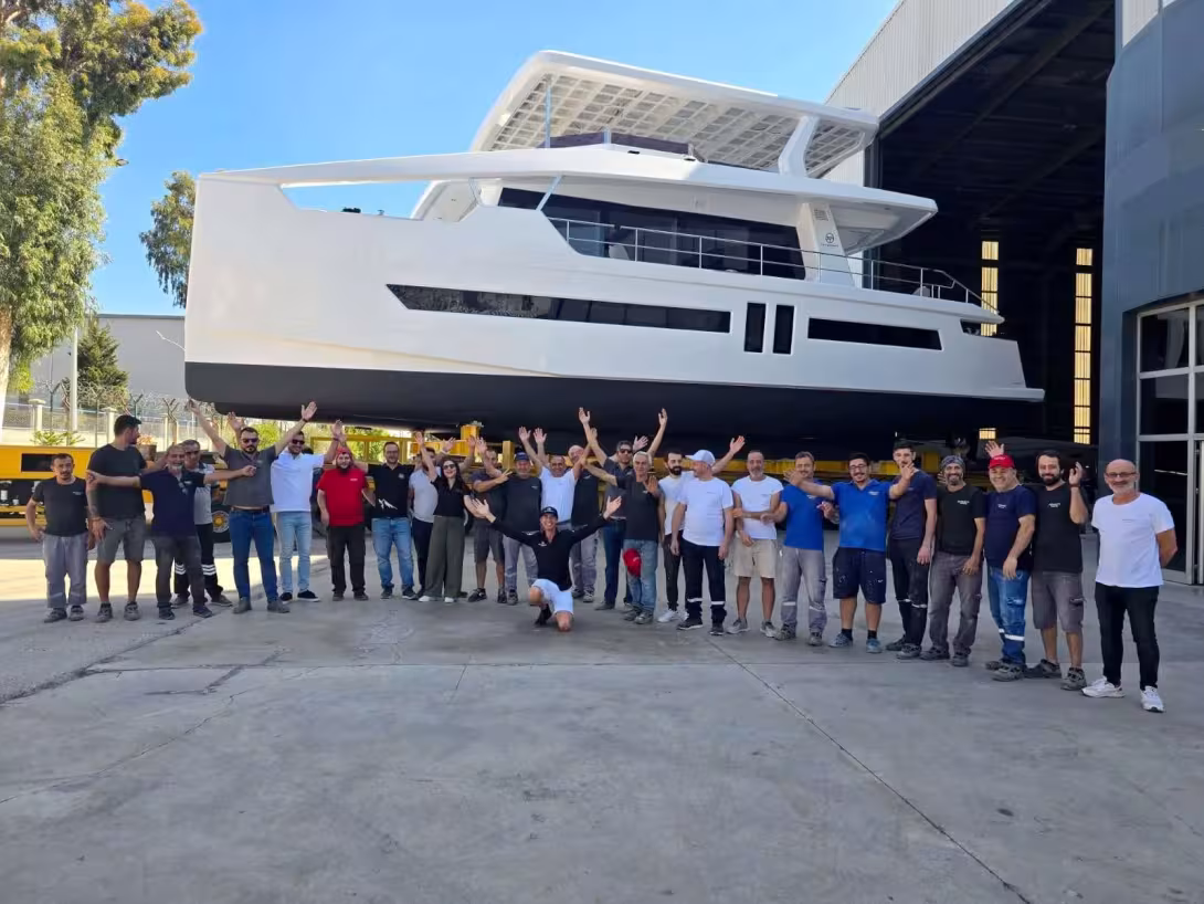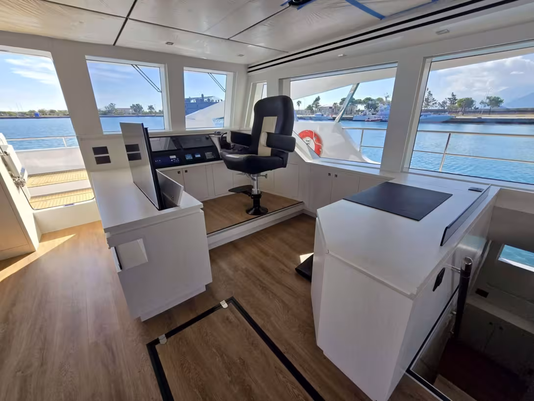 Sur le plan du design, ce powercat se distingue par ces audacieuses arches qui prolonge le toit du rouf – sensiblement élargi pour protéger les passavants et offrir une surface maximum de panneaux solaires. Contrairement à de nombreux powercats « solaires », ce modèle préserve tout de même un solarium pour l’équipage – il s’agit du centre du pontage avant. Le premier Solar-E60 dispose d’un grand flybridge avec poste de commande ; une version Coupe figure au catalogue. « Nous ne nous contentons pas de construire des yachts ; nous façonnons l’avenir du luxe durable, explique Grant Hudson, directeur de Sunpower Yachts. Le Solar-E60 illustre parfaitement ce qu’il est possible d’accomplir lorsque la technologie et la nature œuvrent en harmonie. » Grâce à ses 20 kWc de panneaux solaires, ce powercat est en mesure d’offrir une autonomie illimitée à une vitesse de croisière de 4 à 6 nœuds en mode full électrique.