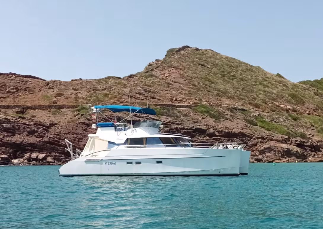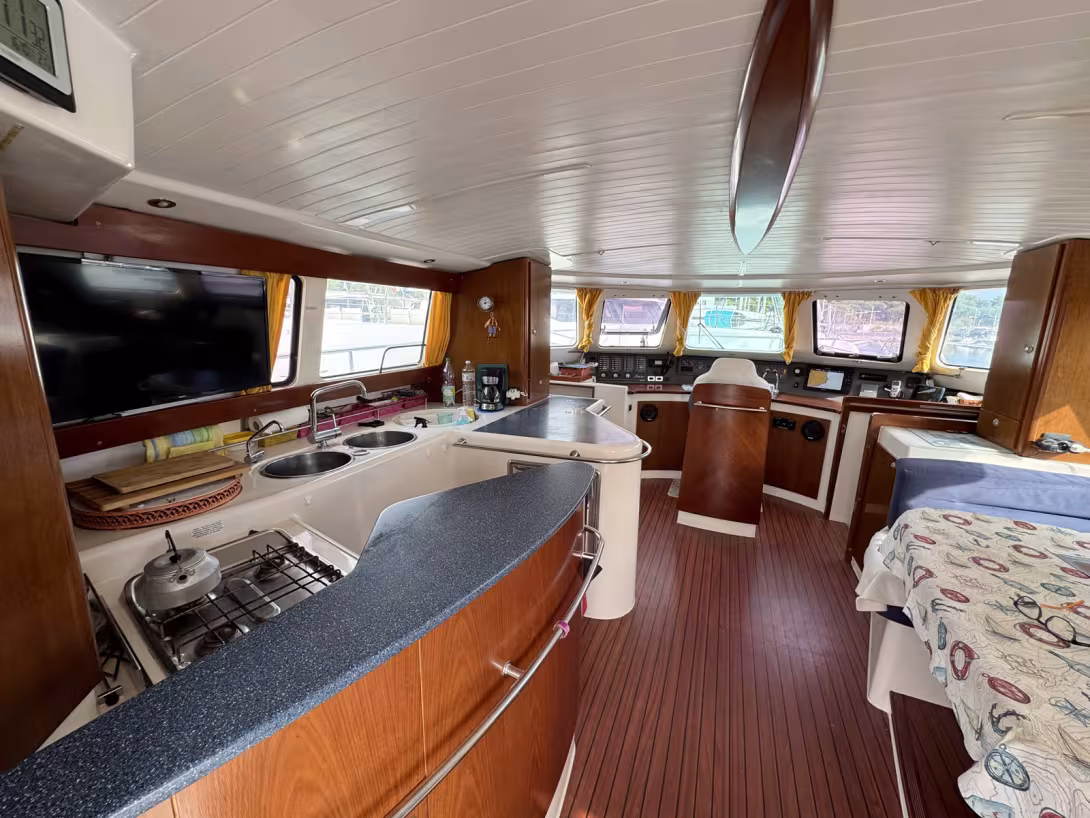 Le modèle que nous vous présentons ici peut se targuer de trois records : c’est le seul powercat, c’est le moins cher et c’est le plus ancien ! En effet, le Maryland 37 que nous découvrons a été construit en 2004 ; il s’agit du premier catamaran à moteur construit par Fountaine Pajot – la série a démarrée en 1998. A l’époque, Jean-François Fountaine – co-fondateur du chantier – expliquait qu’il s’agissait « avant tout d’un bateau de voyage, pas d’une vedette rapide. Nous avons voulu créer une unité où il fait bon vivre ». De fait, la motorisation se limitait à 75 ch en série (jusqu’à x 140 ch en option), ce qui classe donc le Maryland dans la famille des trawlers. Si le plan de pont trahit un peu son âge, la nacelle reste très séduisante avec son imposant tableau de bord et les aménagements permettent d’accueillir 6 personnes dans de bonnes conditions de confort.