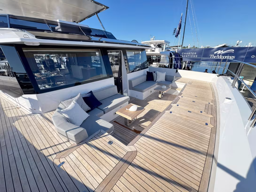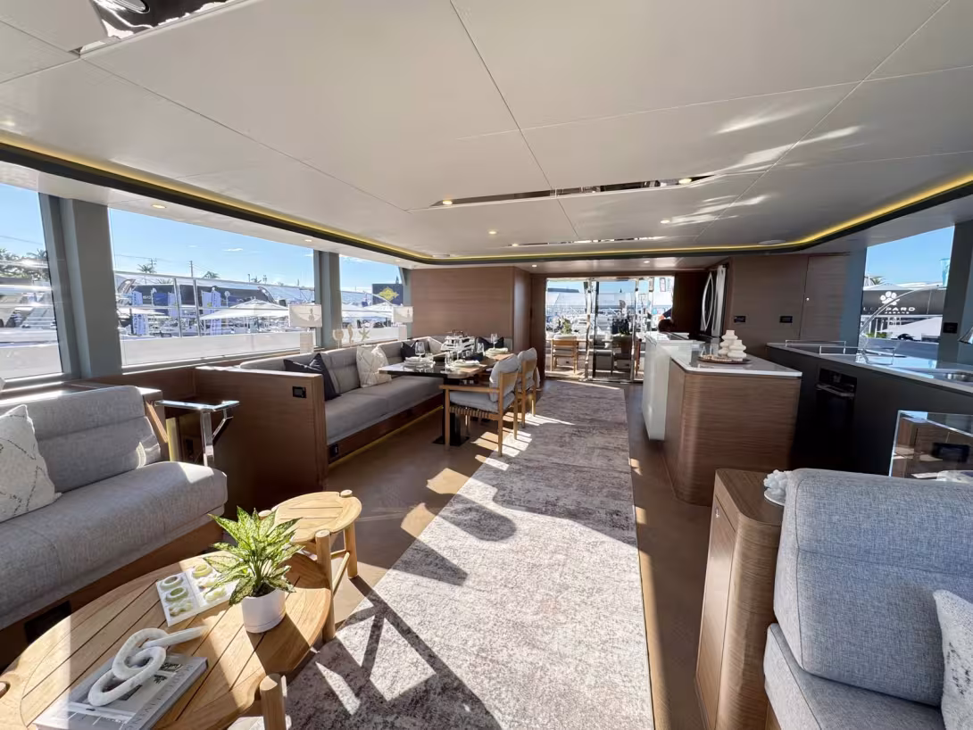 Pour vous donner une idée de la capacité de ce powercat, nous étions une vingtaine assis sur le flybridge pour la conférence de presse et il restait de la place ! Ce S60 offre également une nacelle très généreusement vitrée. Dans les coques, on peut compter sur 4 cabines invités et deux cabines équipage. Pour l’heure, la propulsion est assurée par deux blocs de 440 ch pour une vitesse de croisière de 10 noeuds et une vitesse max de 15 nœuds ; ces performances devraient être prochainement rehaussées de 8 nœuds grâce à des moteurs de 700 ch. Un important parc batterie lithium-phosphate alimente tous les équipements à bord, notamment la climatisation, et peut compter sur la puissante charge assurée par les 8,3 kWc de panneaux solaires.