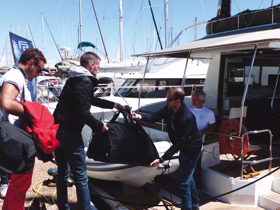 Si porter des chaussures est une précaution pour les simples déplacements à bord, cela devient indispensable dès que l’on commence à manœuvrer le mouillage. La manipulation de l’ancre, de la chaîne et du câblot impose d’avoir les pieds bien protégés, sous peine de se faire écraser un orteil. Les actions manuelles sur la ligne de mouillage – rallonger ou raccourcir – demande une vigilance extrême : les gants seront bien utiles pour ne pas se brûler ou se couper. Le maniement des bouts est en général un autre sujet à bobos. Les brûlures sévères sont à craindre si l’on s’évertue à vouloir retenir l’écoute qui ne demande qu’à filer sous la charge d’une voile. La position des mains sur le bout ne doit jamais être trop proche de la poupée de winch ou du taquet coinceur. Si le temps de lâcher prise est trop court, vous risquez de vous faire coincer un doigt – ou même la main à bord d’un gros multicoque. Installer le moteur hors-bord de l’annexe comporte également des moments critiques, surtout quand vous le réceptionnez dans le dinghy. Un palan soulagera le poids du moteur afin de ne pas tomber en l’attrapant. Les mouillages où il est nécessaire de frapper une amarre à terre ne sont pas exempts de risque, avec les algues glissantes, les rochers escarpés, et parfois les oursins.