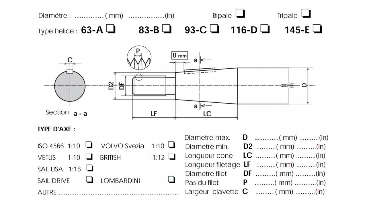Une fois que vous avez choisi votre modèle, le constructeur (ici J-Prop) vous demandera le sens de rotation, les cotes de vos arbres d’hélice, mais également les caractéristiques des cônes (en bout d’arbre) et de la clavette, le type et la longueur du filetage.