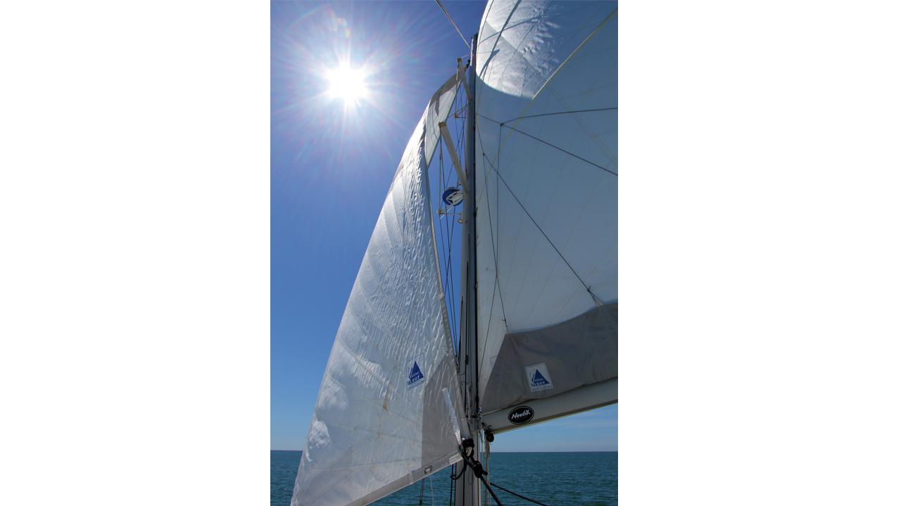 Pour un rendement optimal au près, il convient de bien régler ses voiles. La grand-voile est bien bordée à l’écoute et le chariot permet de contrôler le vrillage de la chute. Les penons indiquent le réglage optimum ; s’ils rentrent, la chute est trop fermée ; s’ils sortent, la chute est trop ouverte.