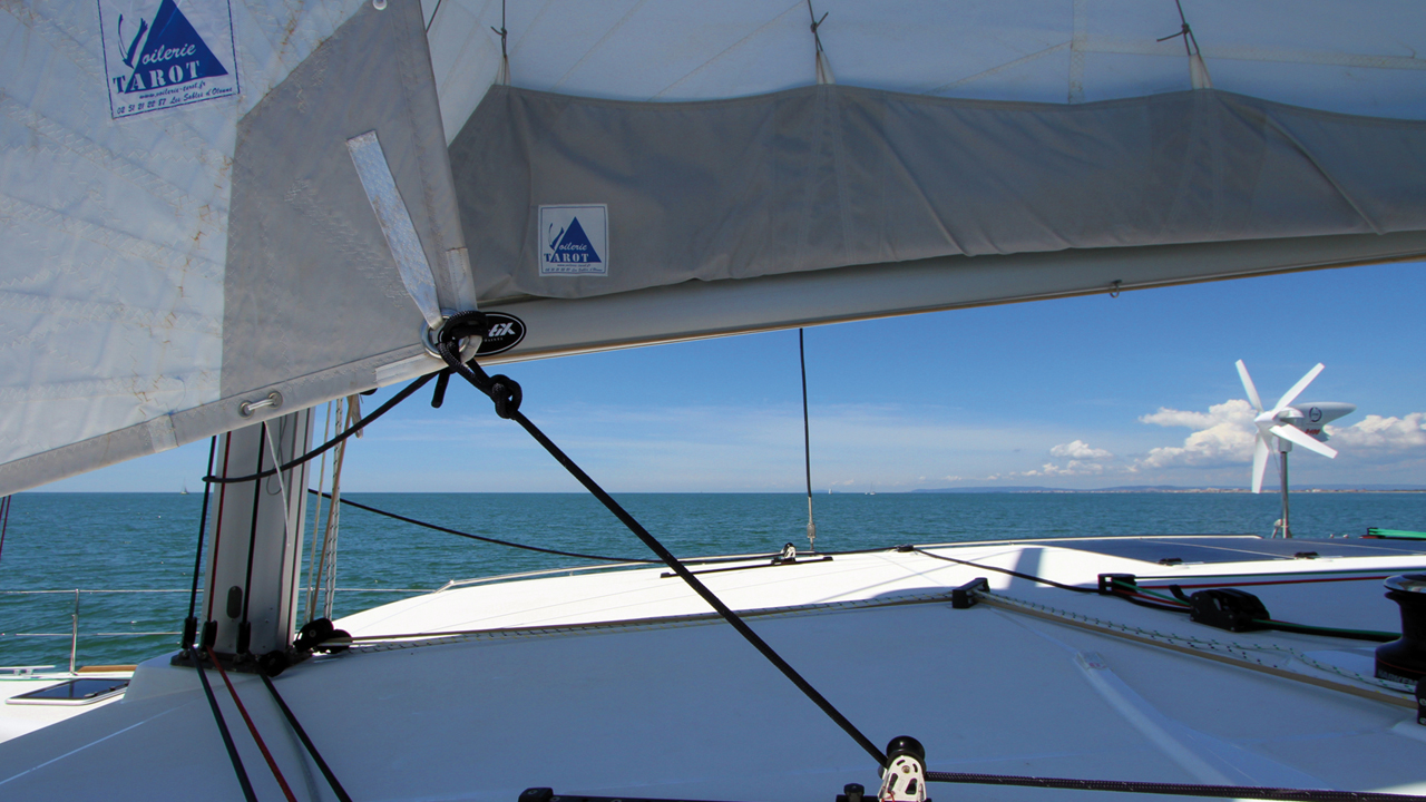 Sur un multicoque, pas de gîte, et donc de gros efforts sur le gréement… et les voiles. D’où l’intérêt d’opter pour des matériaux parfaitement bloqués. Le polyester des voiles livrées en série se déforme très vite et handicape, avec un creux trop prononcé, le rendement du bateau au près. L’Hydranet, en grande croisière, est un bon compromis performances/résistance.